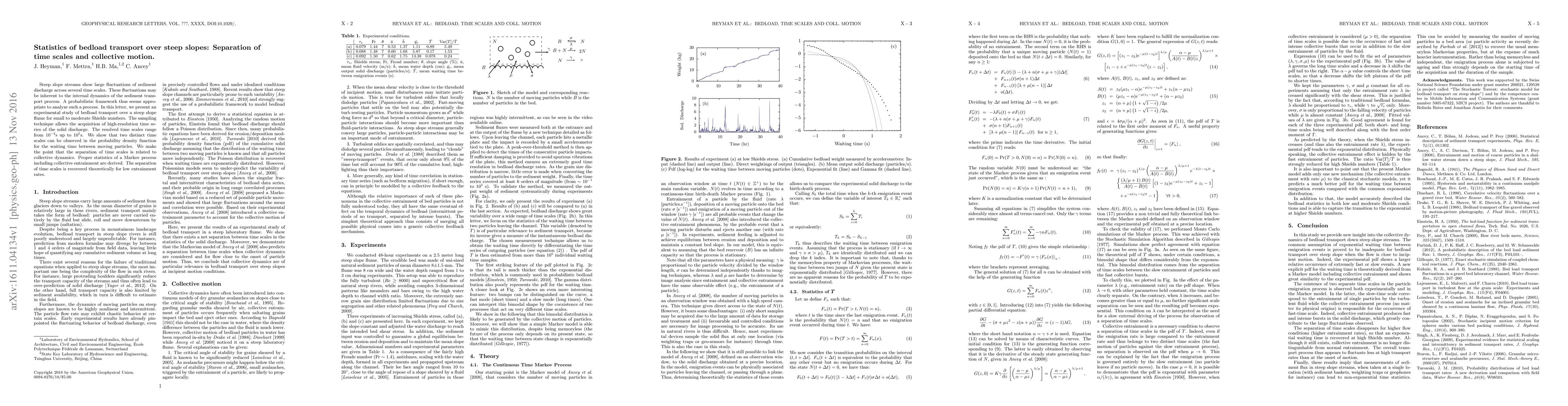 Steep slope streams show large fluctuations of sediment discharge across several time scales. These fluctuations may be inherent to the internal dynamics of the sediment transport process. A probabilistic framework thus seems appropriate to analyze such a process. In this letter, we present an experimental study of bedload transport over a steep slope flume for small to moderate Shields numbers. The sampling technique allows the acquisition of high-resolution time series of the solid discharge. The resolved time scales range from $10^{-2}$s up to $10^{5}$s. We show that two distinct time scales can be observed in the probability density function for the waiting time between moving particles. We make the point that the separation of time scales is related to collective dynamics. Proper statistics of a Markov process including collective entrainment are derived. The separation of time scales is recovered theoretically for low entrainment rates.