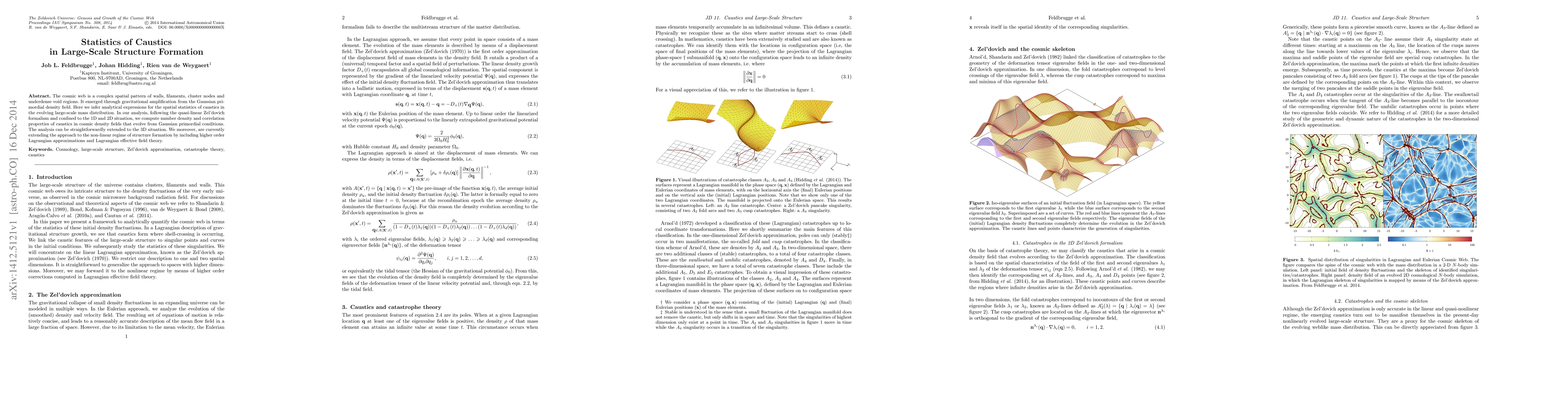 The cosmic web is a complex spatial pattern of walls, filaments, cluster nodes and underdense void regions. It emerged through gravitational amplification from the Gaussian primordial density field. Here we infer analytical expressions for the spatial statistics of caustics in the evolving large-scale mass distribution. In our analysis, following the quasi-linear Zeldovich formalism and confined to the 1D and 2D situation, we compute number density and correlation properties of caustics in cosmic density fields that evolve from Gaussian primordial conditions. The analysis can be straightforwardly extended to the 3D situation. We moreover, are currently extending the approach to the non-linear regime of structure formation by including higher order Lagrangian approximations and Lagrangian effective field theory.