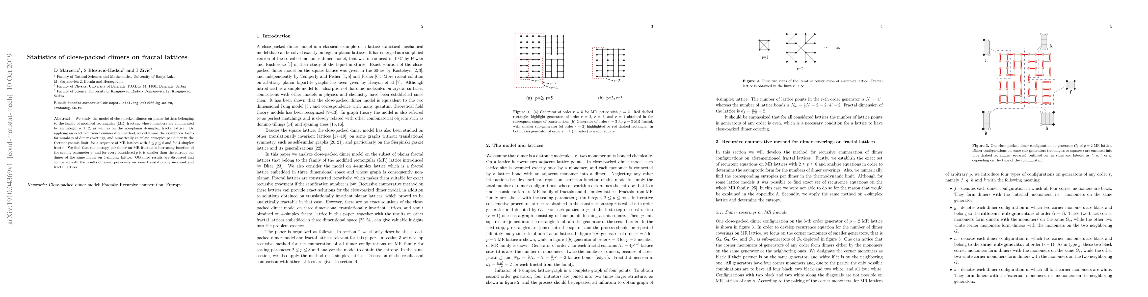 This paper investigates the statistics of close-packed dimers on various fractal lattices, including modified rectangular fractals and the 4-simplex fractal. The study uses an exact recurrence method to determine the asymptotic forms for dimer coverings and finds that entropy per dimer increases with the scaling parameter on MR fractals but remains lower than that on the 4-simplex fractal.