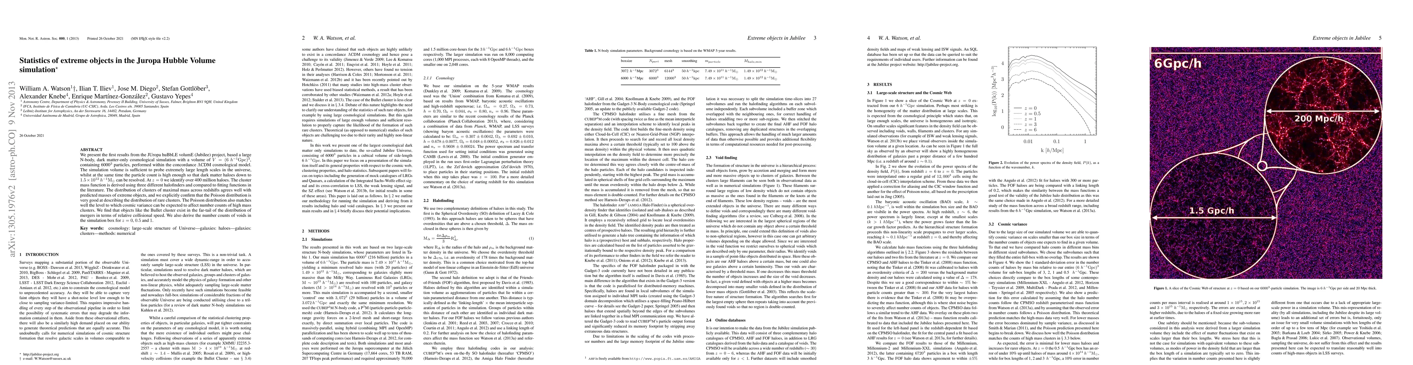 We present the first results from the JUropa huBbLE volumE (Jubilee) project, based a large N-body, dark matter-only cosmological simulation with a volume of $V=(6 h^{-1}\mathrm{Gpc})^3$, containing 6000$^3$ particles, performed within the concordance $\Lambda$CDM cosmological model. The simulation volume is sufficient to probe extremely large length scales in the universe, whilst at the same time the particle count is high enough so that dark matter haloes down to $1.5\times10^{12} h^{-1}\mathrm{M}_\odot$ can be resolved. At $z = 0$ we identify over 400 million haloes. The cluster mass function is derived using three different halofinders and compared to fitting functions in the literature. The distribution of clusters of maximal mass across redshifts agrees well with predicted masses of extreme objects, and we explicitly confirm that the Poisson distribution is very good at describing the distribution of rare clusters. The Poisson distribution also matches well the level to which cosmic variance can be expected to affect number counts of high mass clusters. We find that objects like the Bullet cluster exist in the far-tail of the distribution of mergers in terms of relative collisional speed. We also derive the number counts of voids in the simulation box for $z = 0$, $0.5$ and $1$.