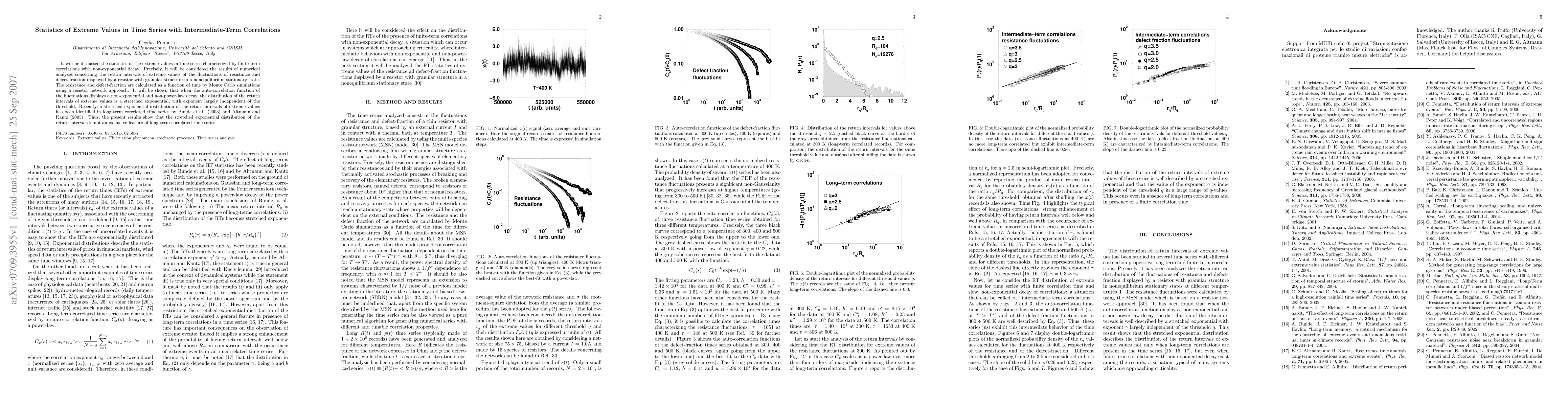 This research examines extreme value statistics in time series with intermediate-term correlations, using Monte Carlo simulations of a granular resistor network. It reveals that non-exponential, non-power-law decay in auto-correlation functions leads to stretched exponential distributions of return intervals for extreme values, demonstrating this phenomenon isn't exclusive to long-term correlated time series.