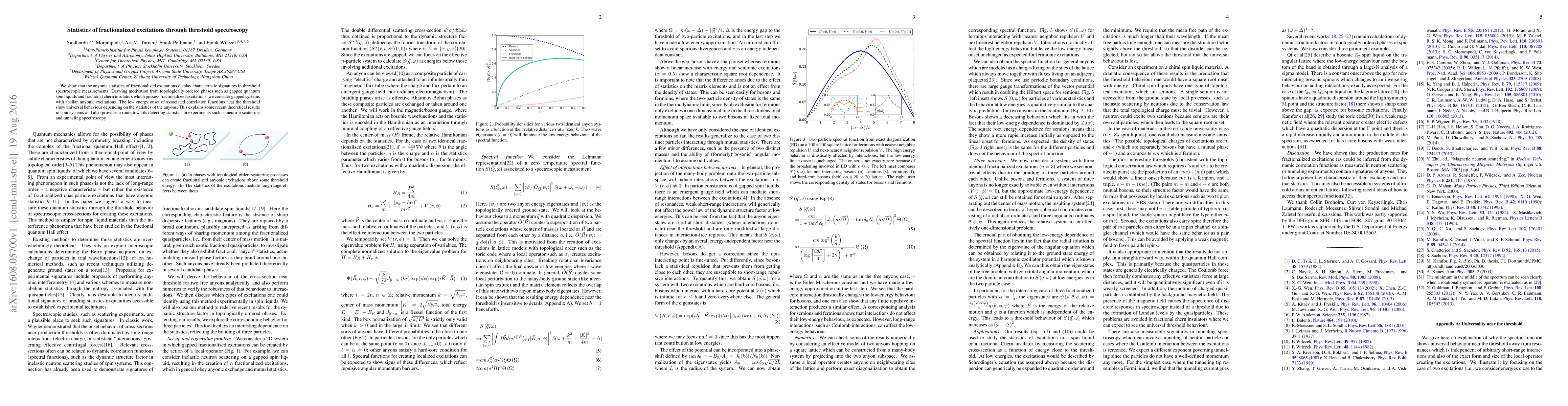 This paper demonstrates that threshold spectroscopy reveals characteristic signatures of anyonic statistics in fractionalized excitations, providing a method for detecting these statistics in experimental settings like neutron scattering and tunneling spectroscopy. The study focuses on gapped systems with abelian anyonic excitations, showing universal behavior in low-energy correlation functions.