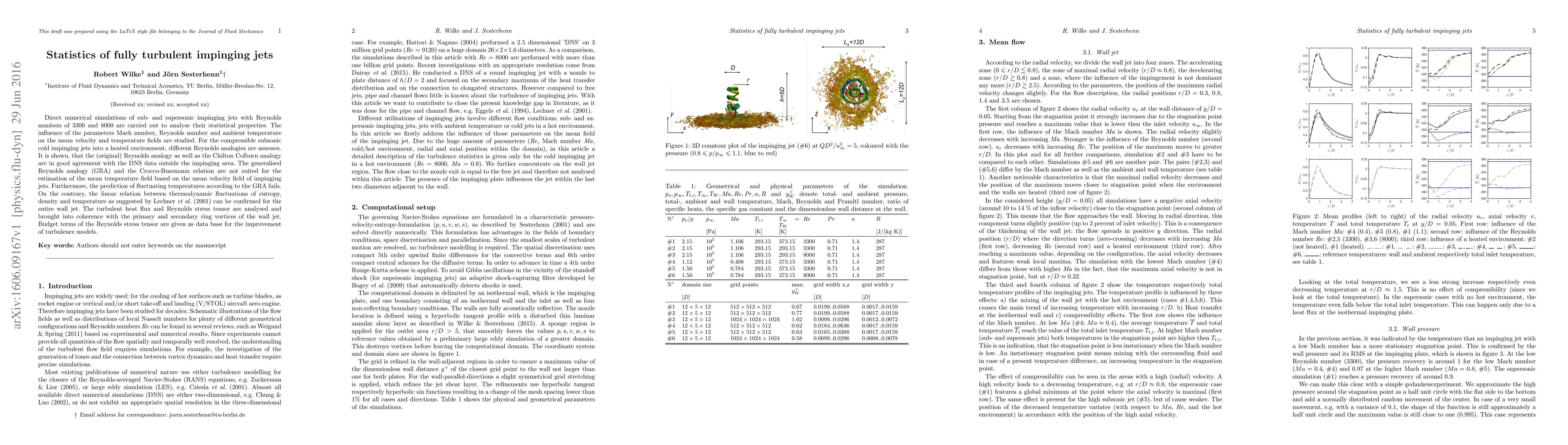 Direct numerical simulations of sub- and supersonic impinging jets with Reynolds numbers of 3300 and 8000 are carried out to analyse their statistical properties. The influence of the parameters Mach number, Reynolds number and ambient temperature on the mean velocity and temperature fields are studied. For the compressible subsonic cold impinging jets into a heated environment, different Reynolds analogies are assesses. It is shown, that the (original) Reynolds analogy as well as the Chilton Colburn analogy are in good agreement with the DNS data outside the impinging area. The generalised Reynolds analogy (GRA) and the Crocco-Busemann relation are not suited for the estimation of the mean temperature field based on the mean velocity field of impinging jets. Furthermore, the prediction of fluctuating temperatures according to the GRA fails. On the contrary, the linear relation between thermodynamic fluctuations of entropy, density and temperature as suggested by Lechner et al. (2001) can be confirmed for the entire wall jet. The turbulent heat flux and Reynolds stress tensor are analysed and brought into coherence with the primary and secondary ring vortices of the wall jet. Budget terms of the Reynolds stress tensor are given as data base for the improvement of turbulence models.