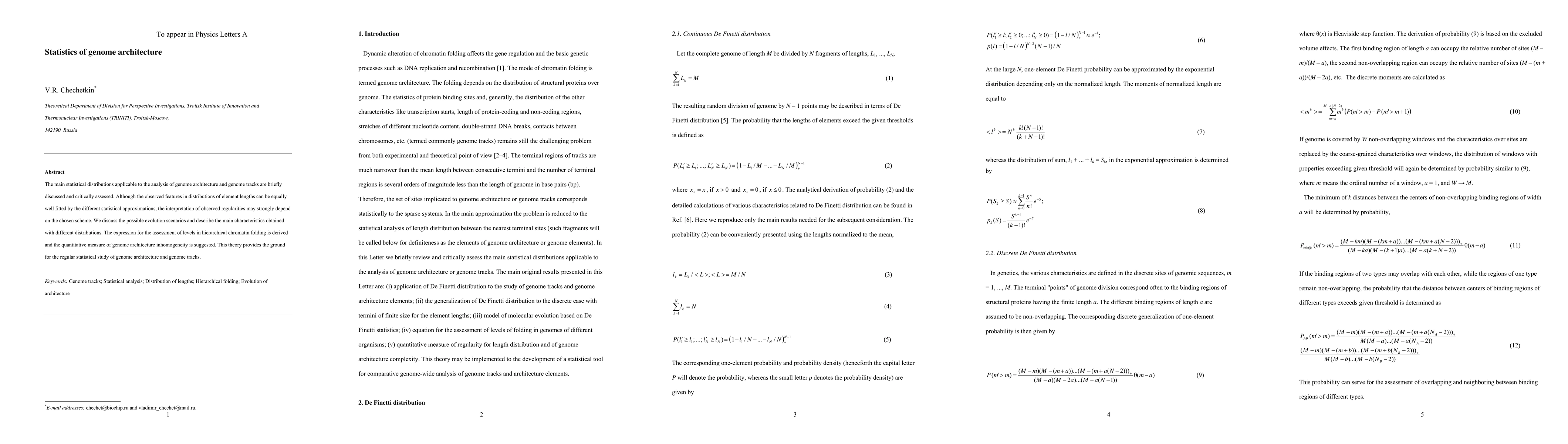The main statistical distributions applicable to the analysis of genome architecture and genome tracks are briefly discussed and critically assessed. Although the observed features in distributions of element lengths can be equally well fitted by the different statistical approximations, the interpretation of observed regularities may strongly depend on the chosen scheme. We discuss the possible evolution scenarios and describe the main characteristics obtained with different distributions. The expression for the assessment of levels in hierarchical chromatin folding is derived and the quantitative measure of genome architecture inhomogeneity is suggested. This theory provides the ground for the regular statistical study of genome architecture and genome tracks.