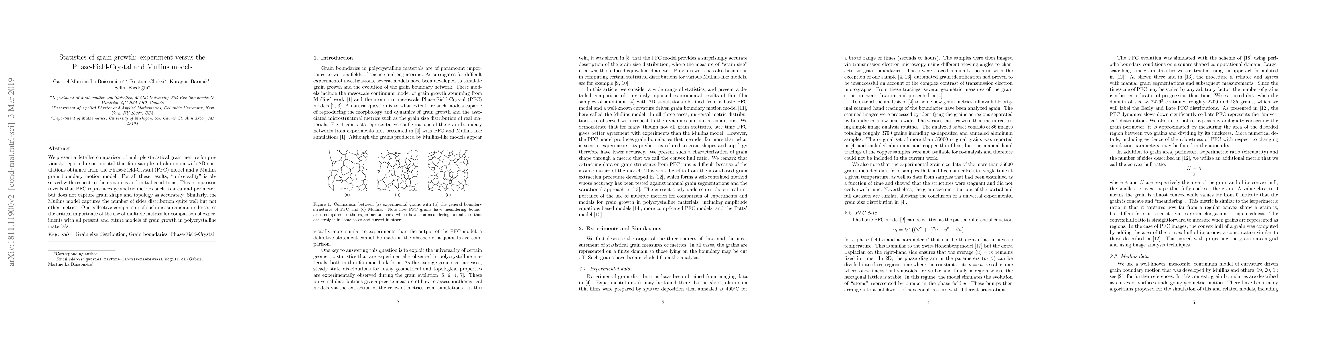 This paper compares experimental aluminum thin film grain metrics with simulations from the Phase-Field-Crystal and Mullins models, finding that while both models reproduce some metrics well, neither fully captures all aspects of grain growth, highlighting the need for multiple metrics in model validation.