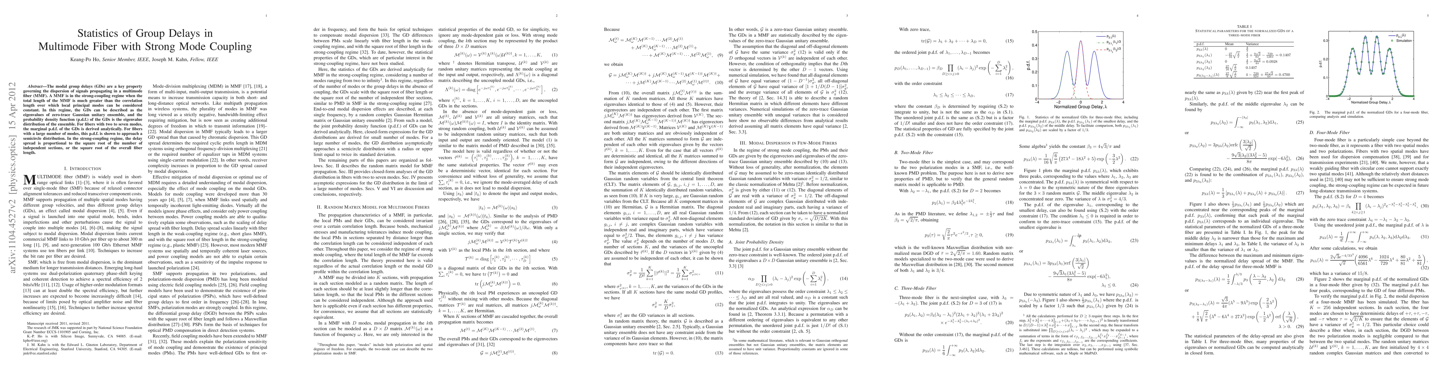 This paper investigates the statistical properties of modal group delays in multimode fibers under strong mode coupling, revealing that the probability density function of these delays approaches a semicircle distribution for large numbers of modes. The delay spread is shown to be proportional to the square root of the fiber length or the number of independent sections.