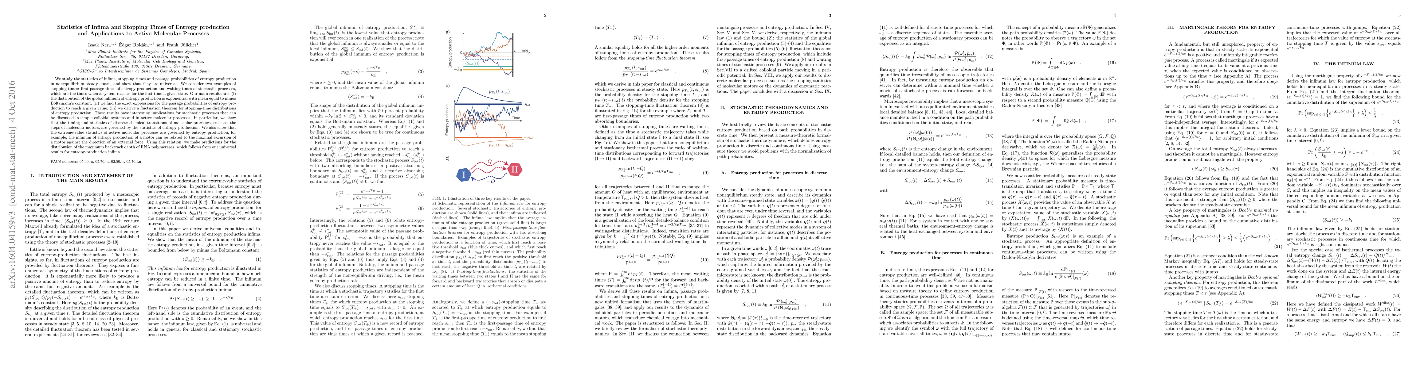 This paper investigates the universal statistics of entropy production infima, stopping times, and passage probabilities in nonequilibrium systems, revealing exponential distributions and exact passage probabilities. It applies these findings to active molecular processes, showing that the timing and extreme-value statistics of molecular motors are governed by entropy production, with implications for predicting the behavior of RNA polymerases.