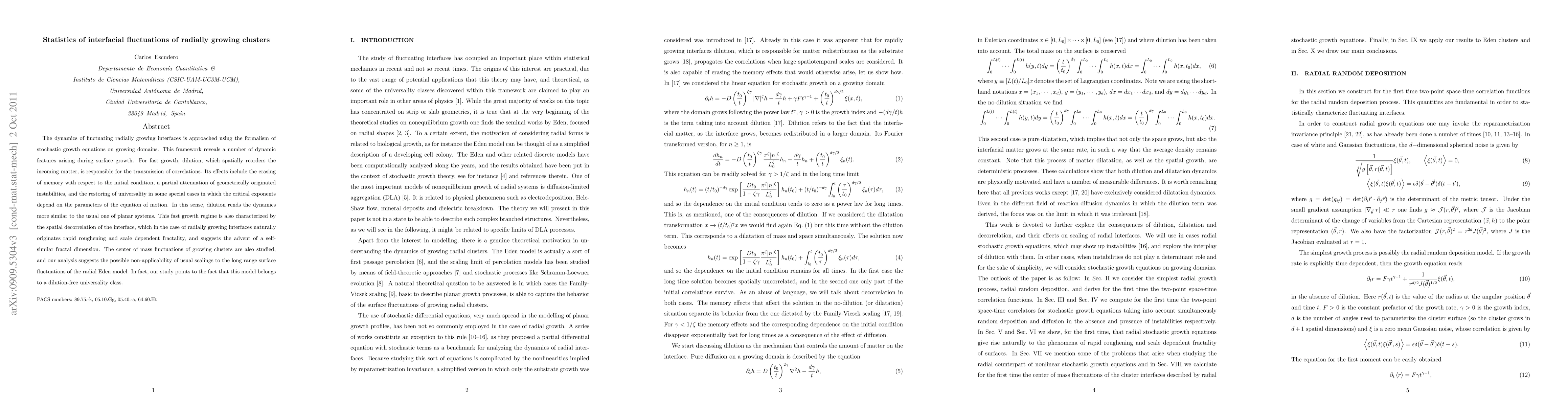 The dynamics of fluctuating radially growing interfaces is approached using the formalism of stochastic growth equations on growing domains. This framework reveals a number of dynamic features arising during surface growth. For fast growth, dilution, which spatially reorders the incoming matter, is responsible for the transmission of correlations. Its effects include the erasing of memory with respect to the initial condition, a partial attenuation of geometrically originated instabilities, and the restoring of universality in some special cases in which the critical exponents depend on the parameters of the equation of motion. In this sense, dilution rends the dynamics more similar to the usual one of planar systems. This fast growth regime is also characterized by the spatial decorrelation of the interface, which in the case of radially growing interfaces naturally originates rapid roughening and scale dependent fractality, and suggests the advent of a self-similar fractal dimension. The center of mass fluctuations of growing clusters are also studied, and our analysis suggests the possible non-applicability of usual scalings to the long range surface fluctuations of the radial Eden model. In fact, our study points to the fact that this model belongs to a dilution-free universality class.