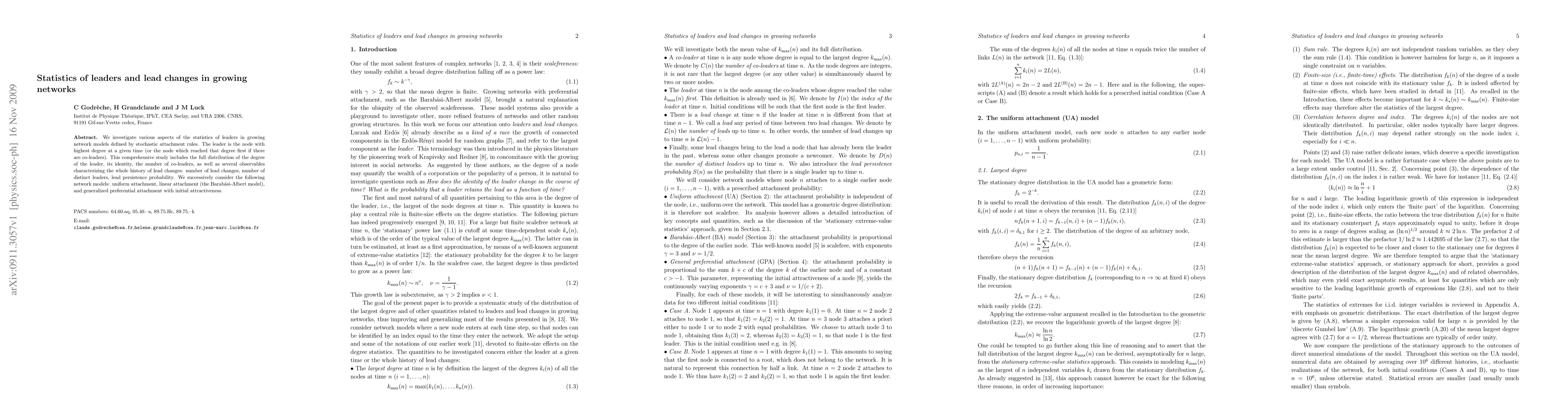 We investigate various aspects of the statistics of leaders in growing network models defined by stochastic attachment rules. The leader is the node with highest degree at a given time (or the node which reached that degree first if there are co-leaders). This comprehensive study includes the full distribution of the degree of the leader, its identity, the number of co-leaders, as well as several observables characterizing the whole history of lead changes: number of lead changes, number of distinct leaders, lead persistence probability. We successively consider the following network models: uniform attachment, linear attachment (the Barabasi-Albert model), and generalized preferential attachment with initial attractiveness.