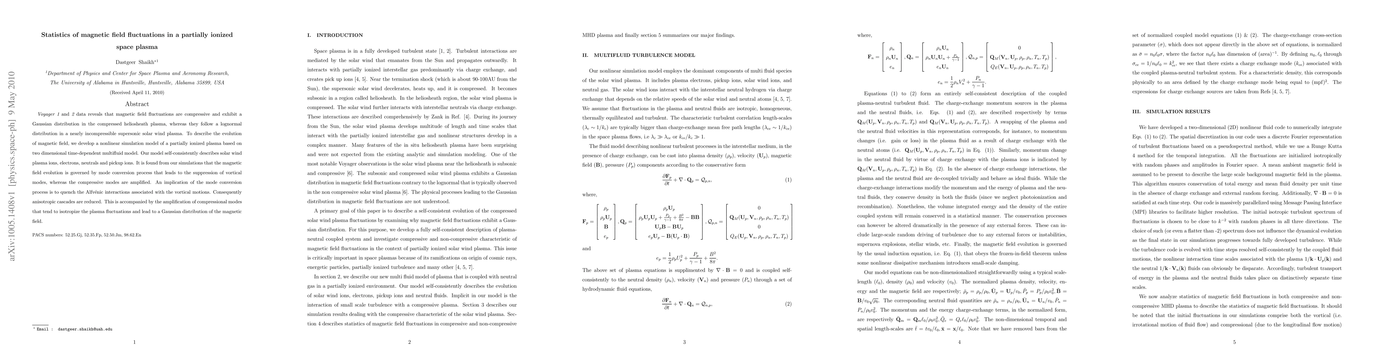 This paper analyzes magnetic field fluctuations in partially ionized space plasmas using Voyager data and a nonlinear simulation model. The study finds that magnetic field fluctuations follow Gaussian distributions in compressed heliosheath plasma and lognormal distributions in supersonic solar wind plasma, with mode conversion processes amplifying compressive modes and suppressing vortical modes.