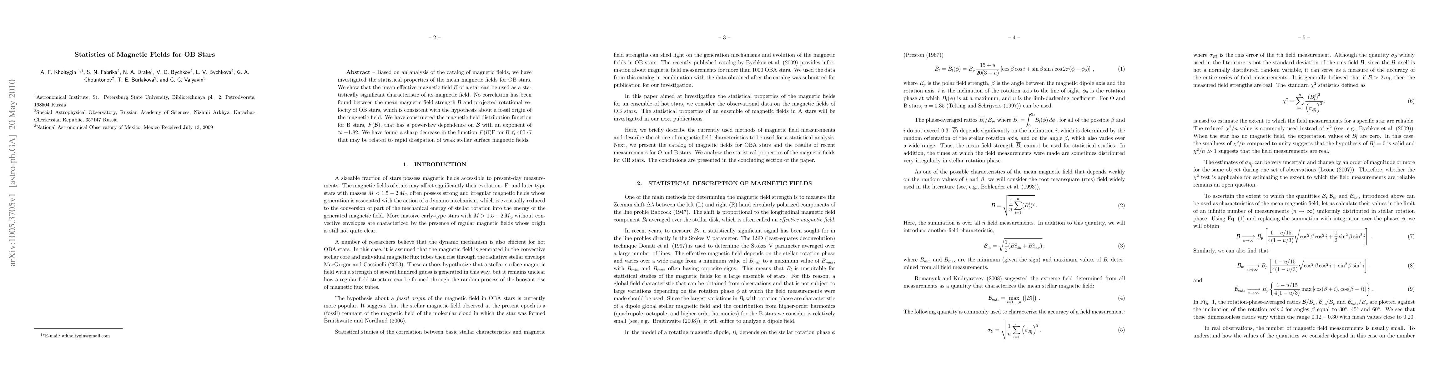 This paper analyzes the statistical properties of magnetic fields in OB stars, finding that the mean magnetic field strength ${\cal B}$ is a significant characteristic but shows no correlation with rotational velocity, supporting a fossil magnetic field origin. The magnetic field distribution function $F({\cal B})$ follows a power-law with an exponent of $\approx -1.82$, with a notable decrease for ${\cal B}\leq 400 G$, possibly due to rapid dissipation of weak magnetic fields.