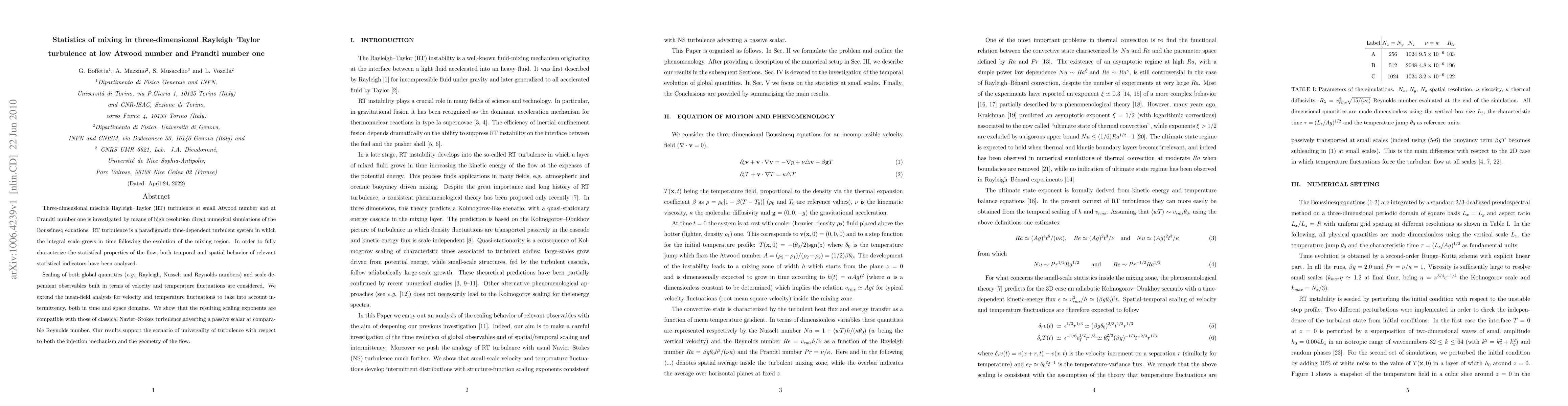 This paper investigates three-dimensional Rayleigh-Taylor turbulence using high-resolution simulations, focusing on statistical properties at low Atwood and Prandtl numbers. The study finds that turbulence scaling exponents align with those of classical Navier-Stokes turbulence, supporting a universal turbulence model regardless of the flow's geometry or injection mechanism.