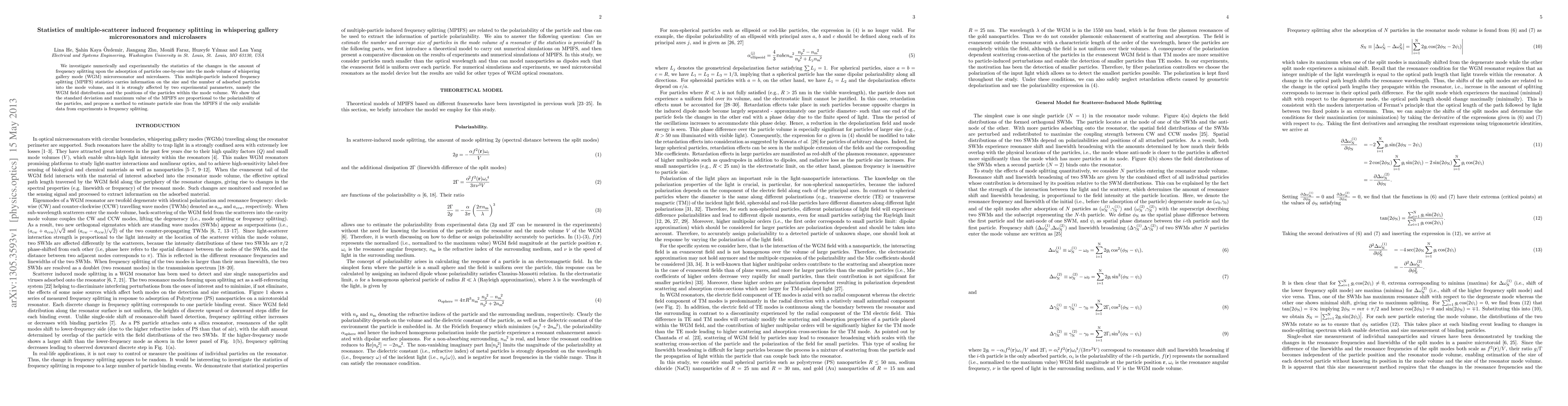 We investigate numerically and experimentally the statistics of the changes in the amount of frequency splitting upon the adsorption of particles one-by-one into the mode volume of whispering gallery mode (WGM) microresonator and microlasers. This multiple-particle induced frequency splitting (MPIFS) statistics carries information on the size and the number of adsorbed particles into the mode volume, and it is strongly affected by two experimental parameters, namely the WGM field distribution and the positions of the particles within the mode volume. We show that the standard deviation and maximum value of the MPIFS are proportional to the polarizability of the particles, and propose a method to estimate particle size from the MPIFS if the only available data from experiments is frequency splitting.