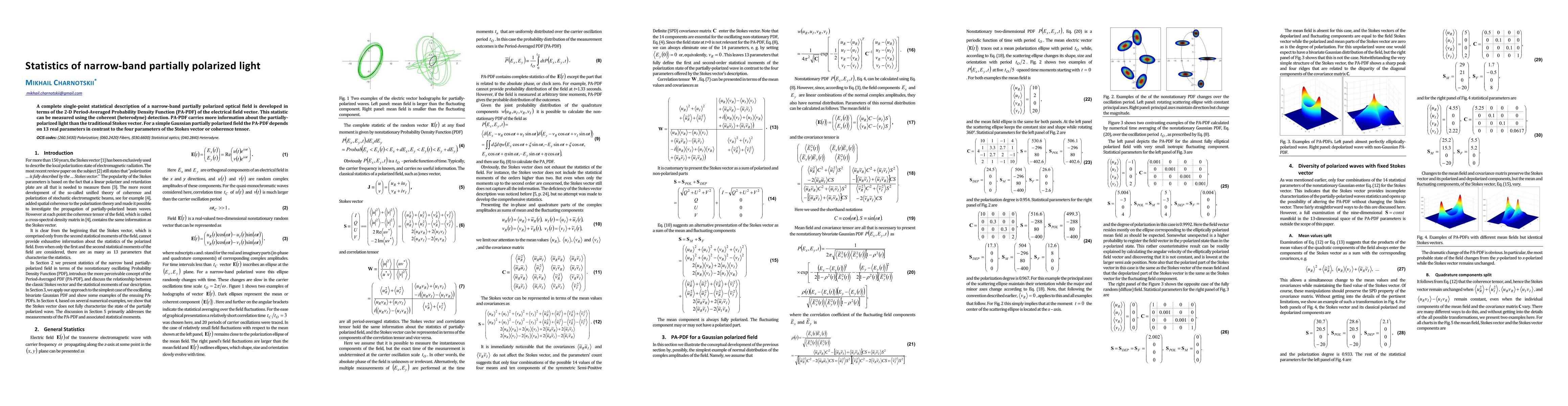 This paper develops a comprehensive statistical model for narrow-band partially polarized light using the 2-D Period-Averaged Probability Density Function (PA-PDF) of the electric field vector, which provides more detailed information than traditional methods like the Stokes vector. The PA-PDF can be measured via coherent detection.