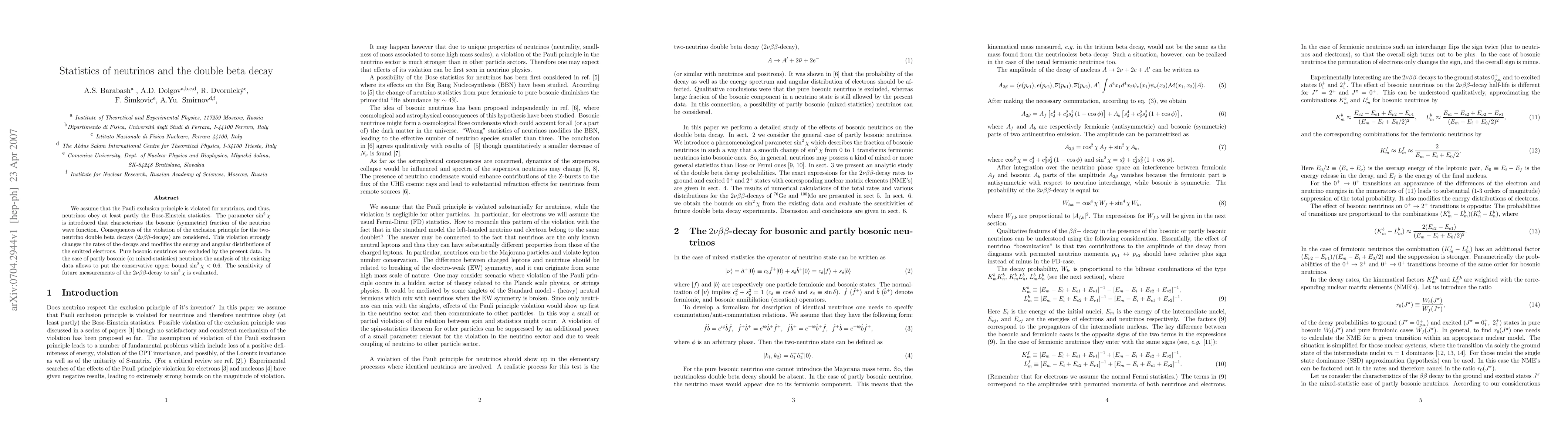 We assume that the Pauli exclusion principle is violated for neutrinos, and thus, neutrinos obey at least partly the Bose-Einstein statistics. The parameter sin^2 chi is introduced that characterizes the bosonic (symmetric) fraction of the neutrino wave function. Consequences of the violation of the exclusion principle for the two-neutrino double beta decays are considered. This violation strongly changes the rates of the decays and modifies the energy and angular distributions of the emitted electrons. Pure bosonic neutrinos are excluded by the present data. In the case of partly bosonic (or mixed-statistics) neutrinos the analysis of the existing data allows to put the conservative upper bound sin^2 chi < 0.6. The sensitivity of future measurements of the two-neutrino double beta decay to sin^2 chi is evaluated.