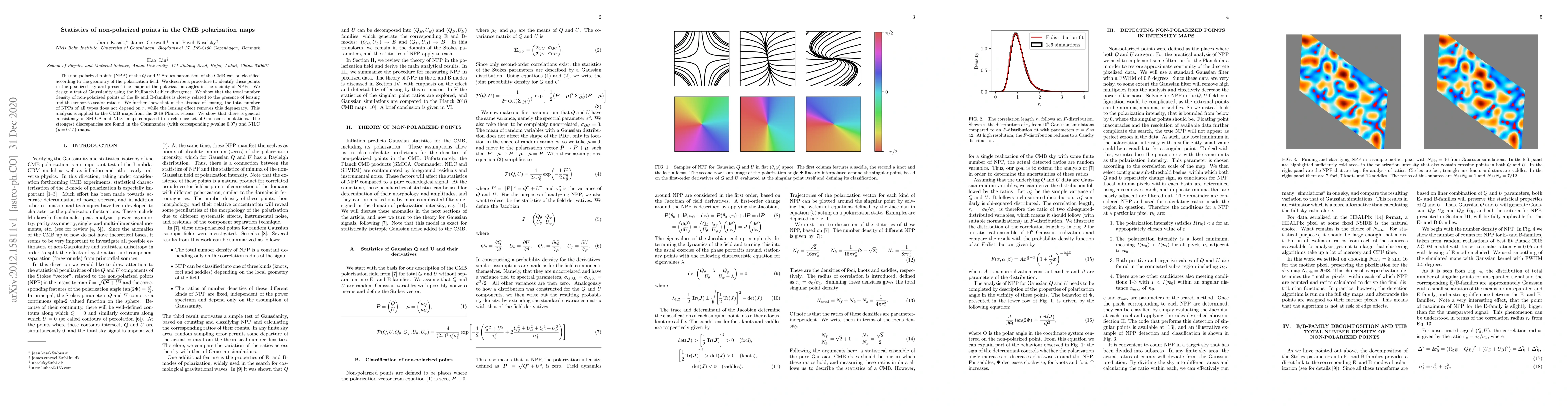 The non-polarized points (NPP) of the $Q$ and $U$ Stokes parameters of the CMB can be classified according to the geometry of the polarization field. We describe a procedure to identify these points in the pixelized sky and present the shape of the polarization angles in the vicinity of NPPs. We design a test of Gaussianity using the Kullback-Leibler divergence. We show that the total number density of non-polarized points of the E- and B-families is closely related to the presence of lensing and the tensor-to-scalar ratio $r$. We further show that in the absence of lensing, the total number of NPPs of all types does not depend on $r$, while the lensing effect removes this degeneracy. This analysis is applied to the CMB maps from the 2018 Planck release. We show that there is general consistency of SMICA and NILC maps compared to a reference set of Gaussian simulations. The strongest discrepancies are found in the Commander (with corresponding $p$-value $0.07$) and NILC ($p = 0.15$) maps.