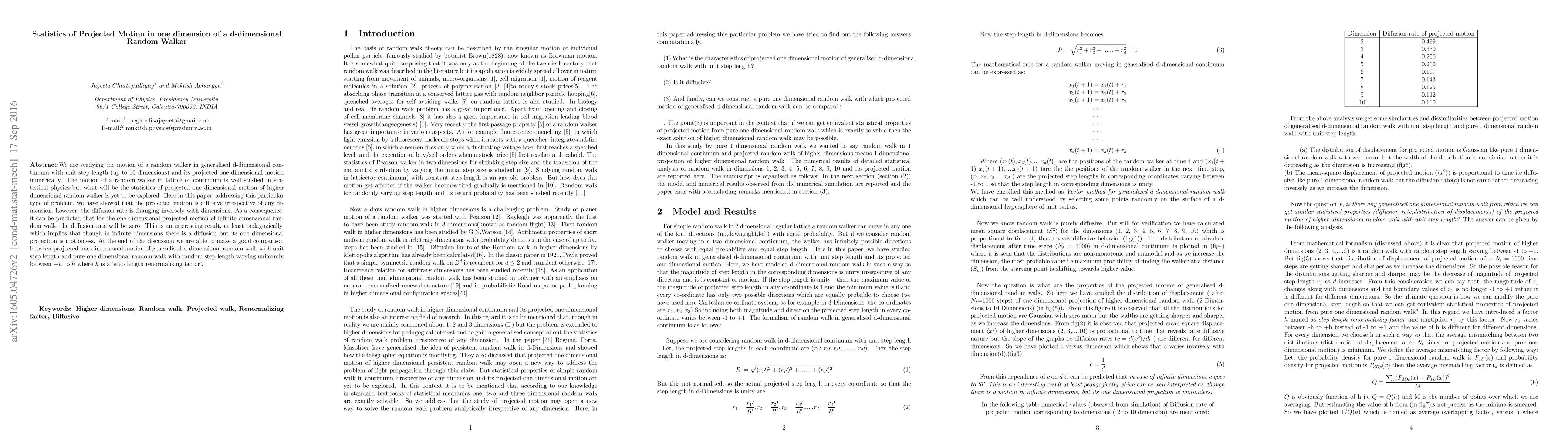 We are studying the motion of a random walker in generalized d dimensional continuum with unit step length (up to 10 dimensions) and its projected one dimensional motion numerically. The motion of a random walker in lattice or continuum is well studied in statistical physics but what will be the statistics of projected one dimensional motion of higher dimensional random walker is yet to be explored. Here in this paper, addressing this particular type of problem, we have showed that the projected motion is diffusive irrespective of any dimension, however, the diffusion rate is changing inversely with dimension. As a consequence, we can say that at infinite dimension the diffusion rate becomes zero. This is an interesting result, at least pedagogically, which implies that though in infinite dimension there is a diffusion but its one dimensional projection is motionless. At the end of the discussion we are able to make a good comparison between projected one dimensional motion of generalized d-dimensional random walk with unit step length and pure one dimensional random walk with random step length varying uniformly between -h to h where h is a step length renormalizing factor.