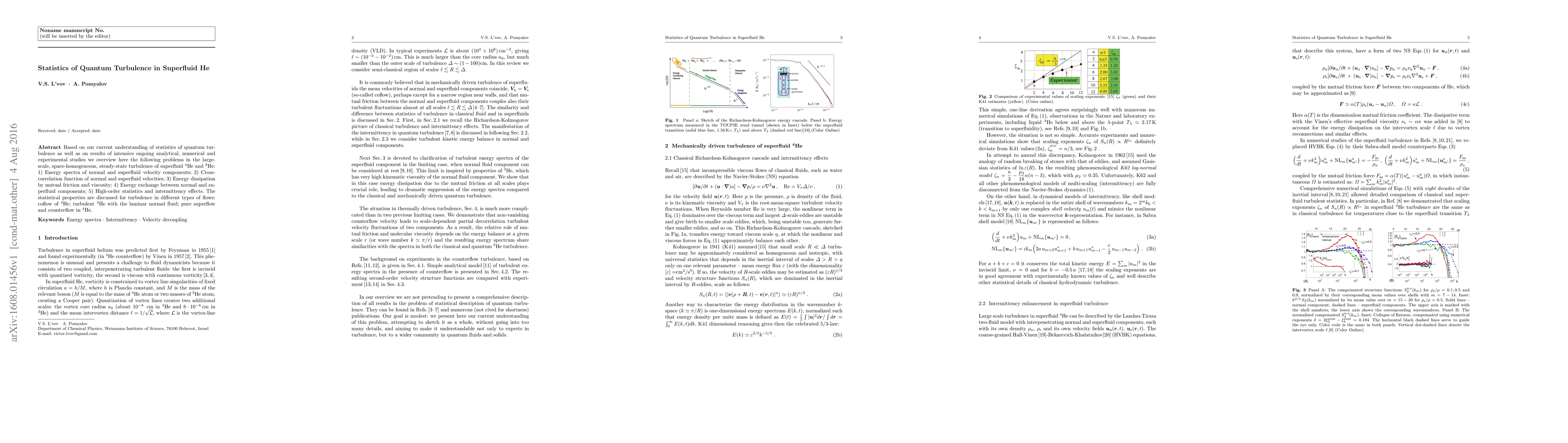 This paper reviews statistical properties and dynamics of quantum turbulence in superfluid helium, focusing on energy spectra, correlations, dissipation mechanisms, and intermittency effects in various flow configurations including coflows and counterflows.