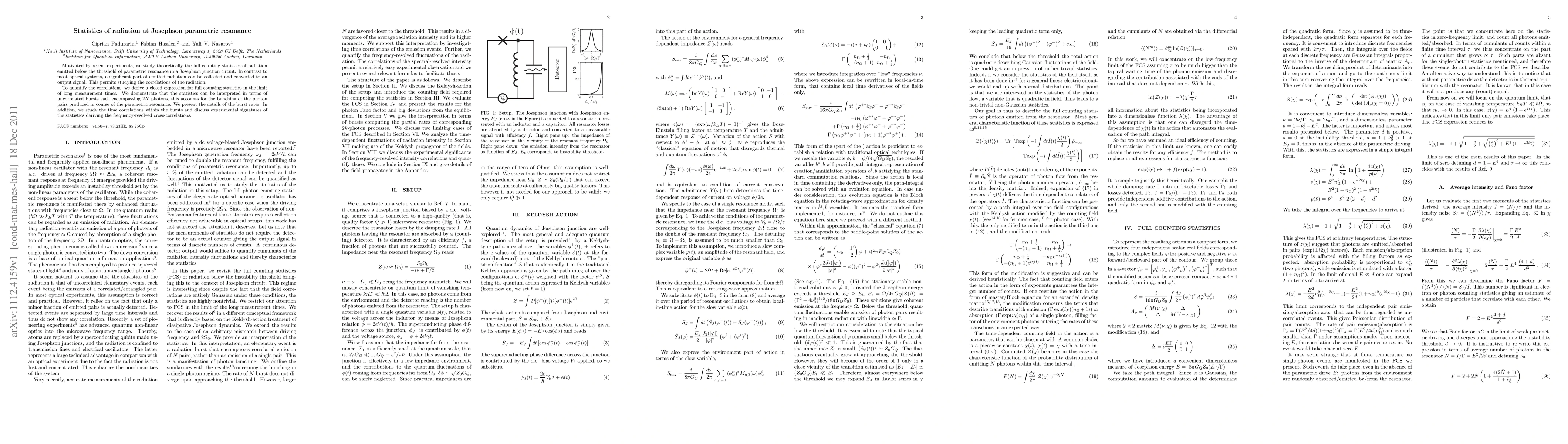 This paper theoretically investigates the full counting statistics of radiation emitted below the threshold of parametric resonance in Josephson junction circuits, deriving a closed expression for long measurement times. It reveals that the emitted radiation exhibits uncorrelated bursts of 2N photons, highlighting the photon pair bunching during parametric resonance, and discusses experimental signatures through frequency-resolved cross-correlations.