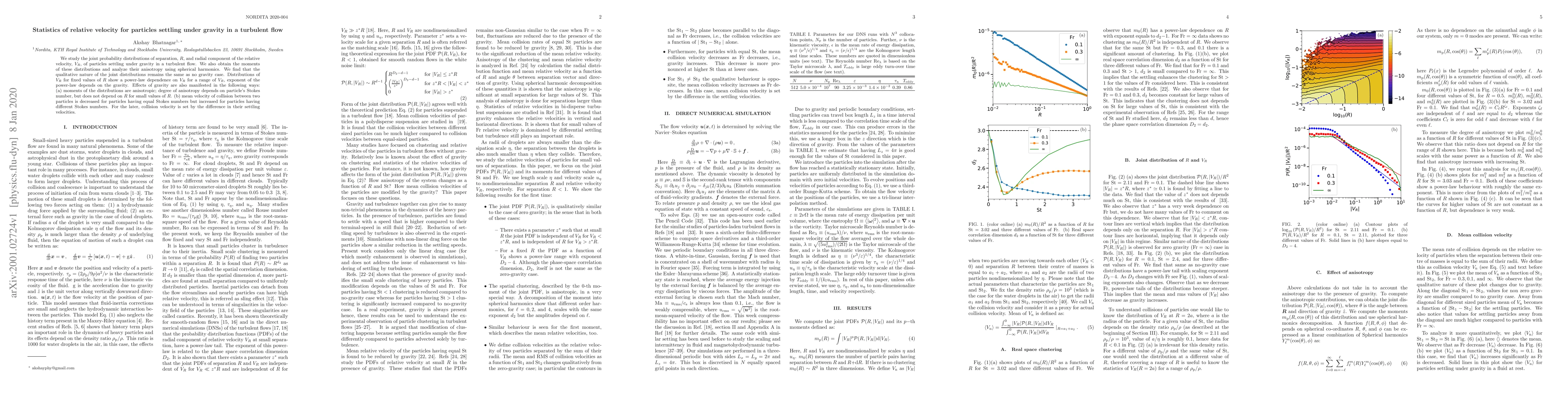 This study investigates the joint probability distributions of separation and radial relative velocity of particles settling under gravity in a turbulent flow, revealing power-law dependencies influenced by gravity. The effects of gravity lead to anisotropic moments and altered mean collision velocities, depending on the particles' Stokes numbers.