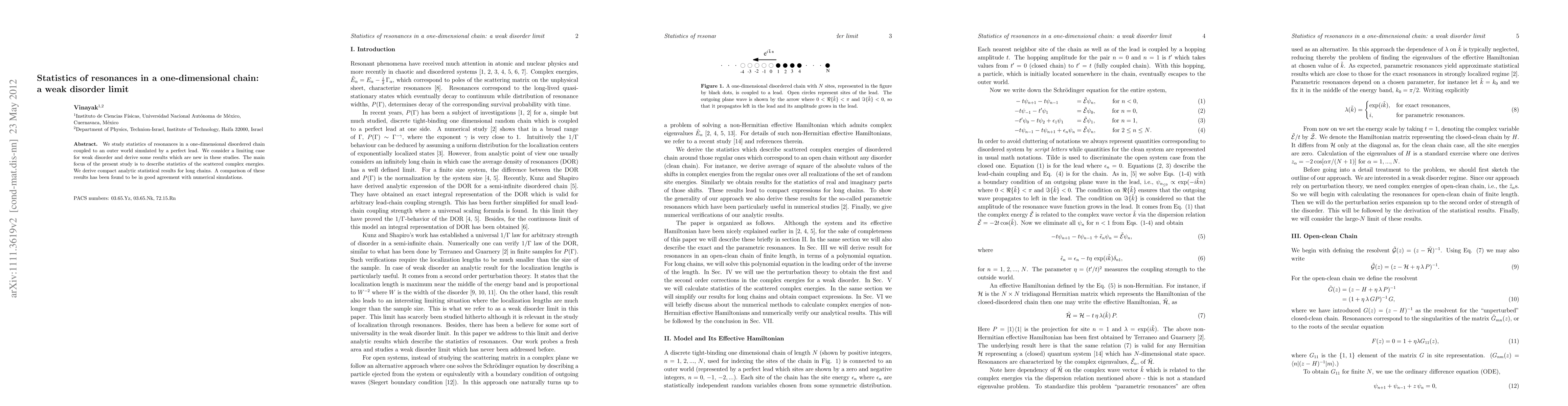 This paper investigates the statistical properties of resonances in a one-dimensional disordered chain with weak disorder, coupled to a perfect lead. The study derives new analytical results for the statistics of scattered complex energies in long chains, which align well with numerical simulations.