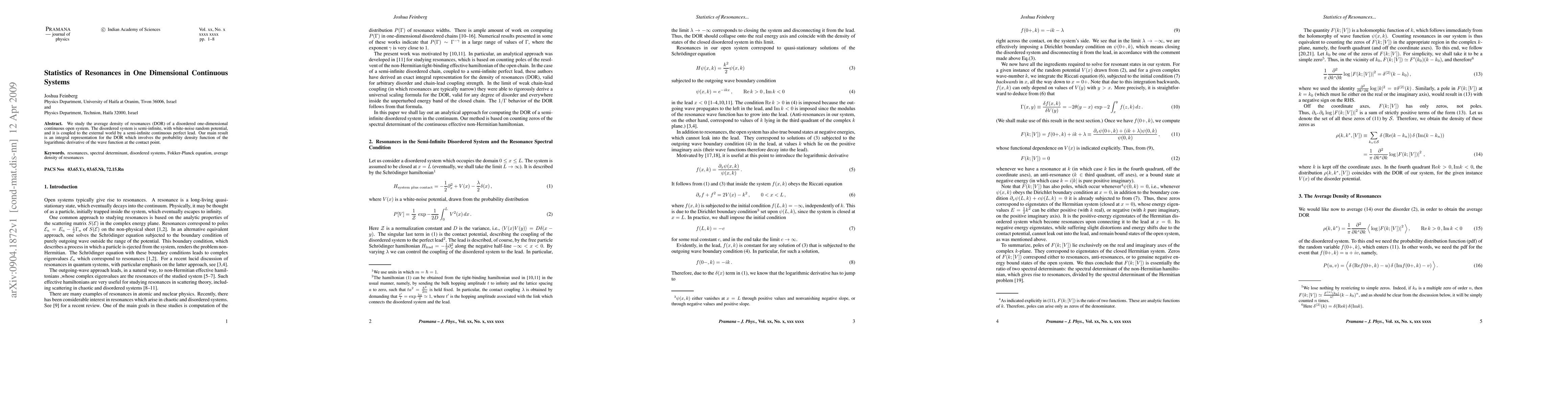 We study the average density of resonances (DOR) of a disordered one-dimensional continuous open system. The disordered system is semi-infinite, with white-noise random potential, and it is coupled to the external world by a semi-infinite continuous perfect lead. Our main result is an integral representation for the DOR which involves the probability density function of the logarithmic derivative of the wave function at the contact point.