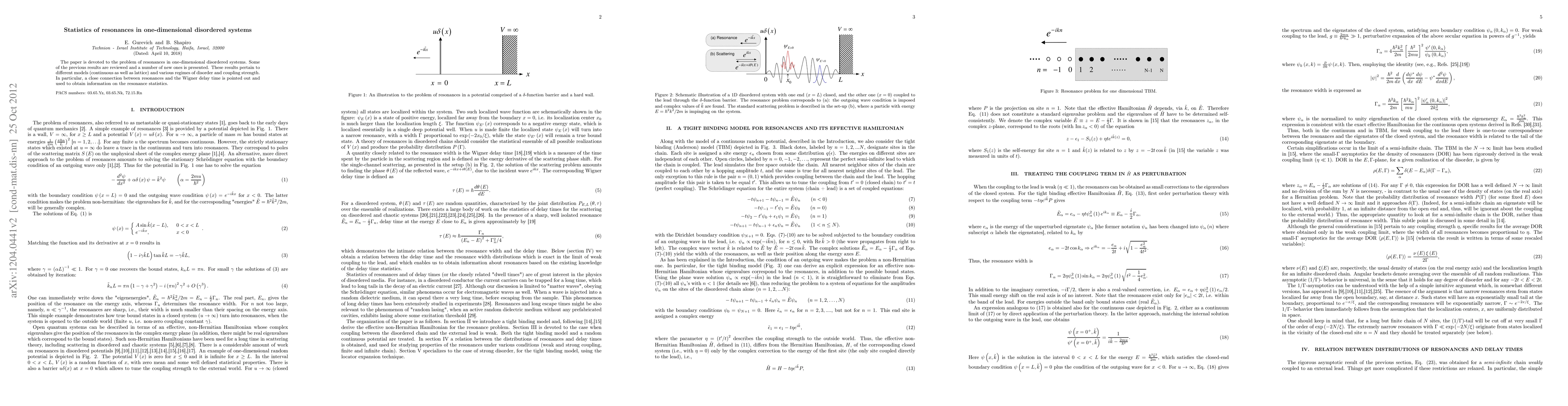 This paper reviews and presents new findings on resonances in one-dimensional disordered systems, highlighting a connection between resonances and the Wigner delay time to analyze resonance statistics across various models and disorder regimes.