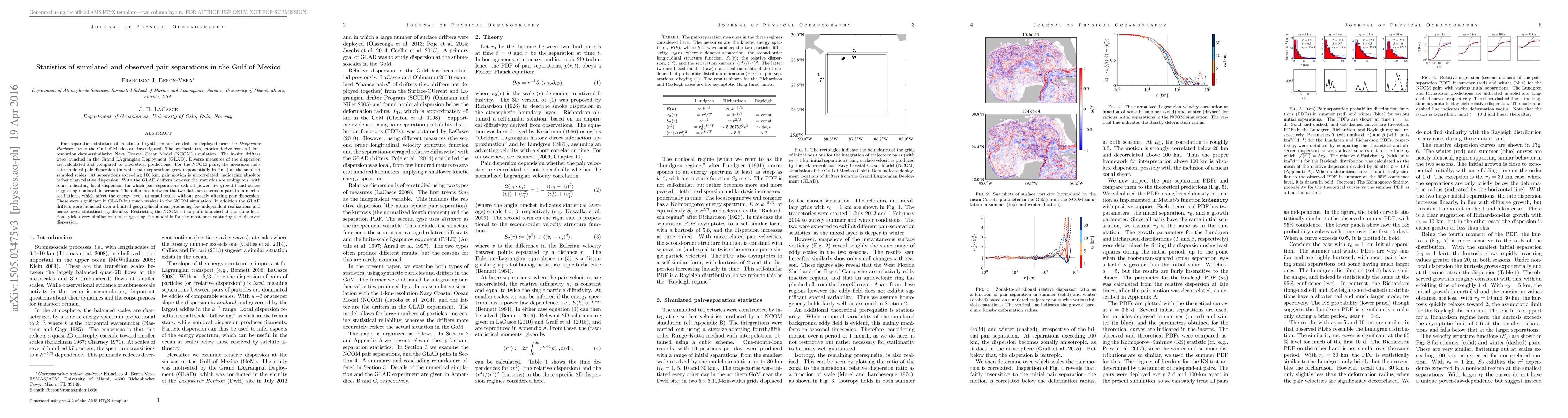 Pair-separation statistics of in-situ and synthetic surface drifters deployed near the \emph{Deepwater Horizon} site in the Gulf of Mexico are investigated. The synthetic trajectories derive from a 1-km-resolution data-assimilative Navy Coastal Ocean Model (NCOM) simulation. The in-situ drifters were launched in the Grand LAgrangian Deployment (GLAD). Diverse measures of the dispersion are calculated and compared to theoretical predictions. For the NCOM pairs, the measures indicate nonlocal pair dispersion at the smallest sampled scales. At separations exceeding 100 km, pair motion is uncorrelated, indicating absolute rather than relative dispersion. With the GLAD drifters however the statistics suggest local dispersion (in which pair separations exhibit power law growth), in line with previous findings. The disagreement stems in part from inertial oscillations, which affect the energy levels at small scales without greatly altering the net particle displacements. They were significant in GLAD but much weaker in the NCOM simulations. In addition the GLAD drifters were launched close together, producing few independent realizations and hence weaker statistical significance. Restricting the NCOM set to those launched at the same locations yields very similar statistics.