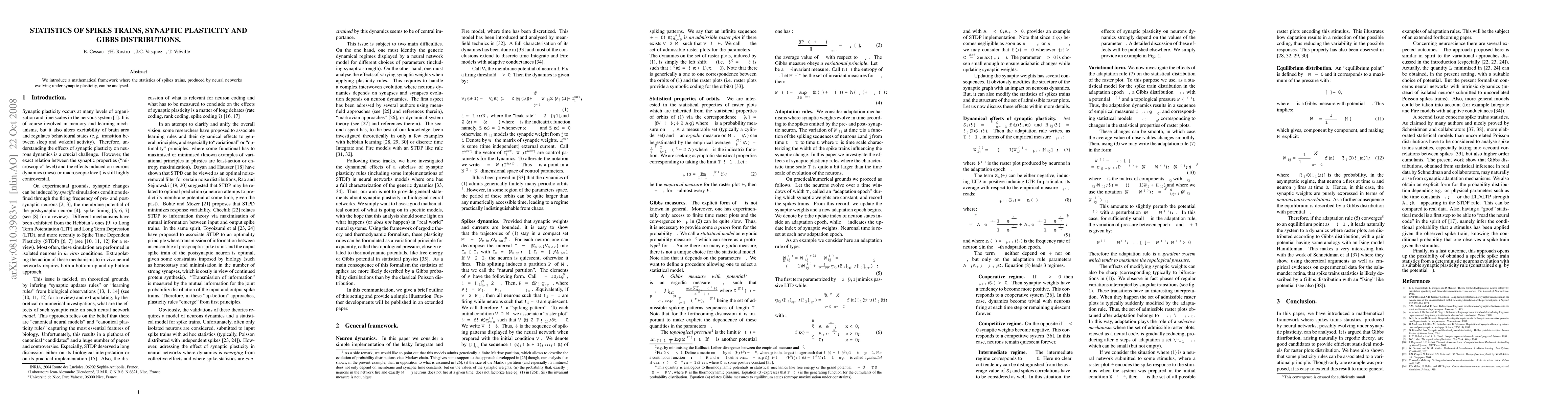 This paper develops a mathematical framework to analyze the statistical properties of spike trains in neural networks undergoing synaptic plasticity, utilizing Gibbs distributions for the analysis. The framework aims to better understand the dynamics of neural networks through statistical modeling.