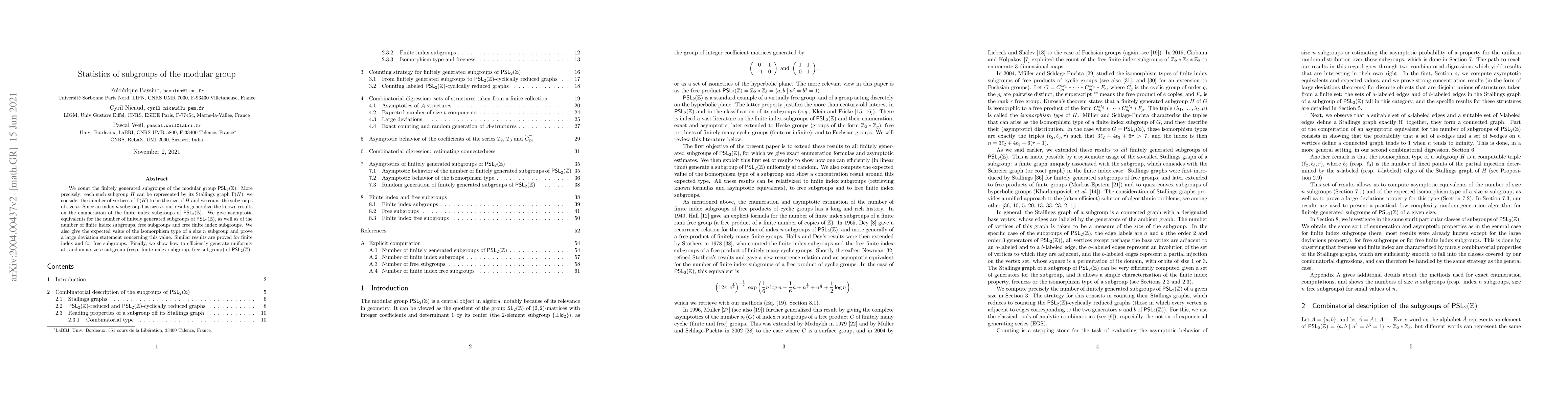 This paper enumerates finitely generated subgroups of the modular group $\textsf{PSL}(2,\mathbb{Z})$, providing asymptotic equivalents for their counts and expected isomorphism types. It also details efficient methods for generating these subgroups uniformly at random.
