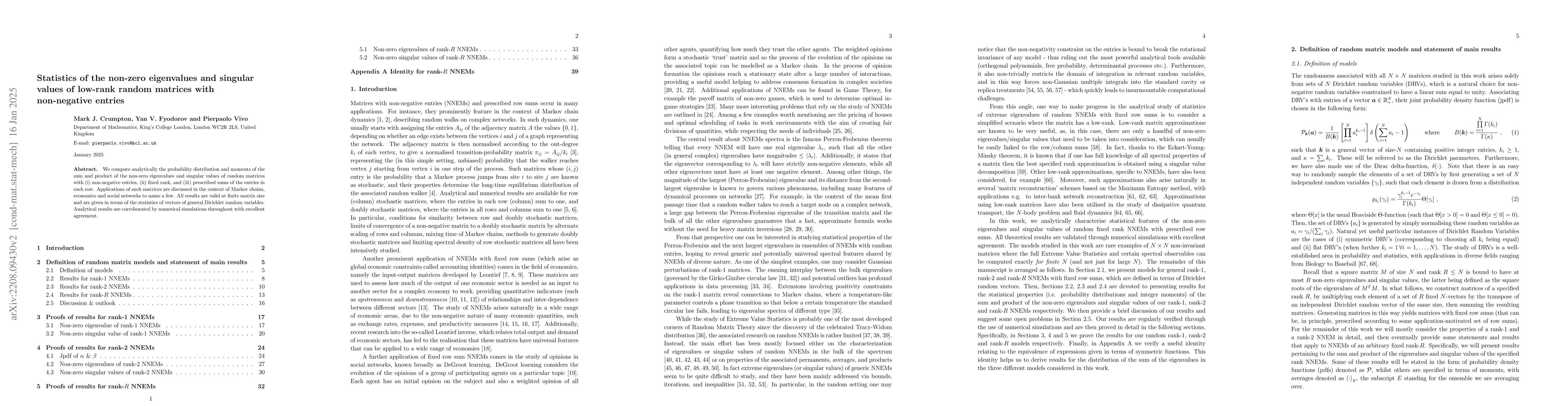 This paper analytically determines the distribution and moments of the largest eigenvalues and singular values for low-rank random matrices with non-negative entries and fixed row/column sums. It also discusses applications to random walk dynamics and network influence metrics, supported by numerical simulations.
