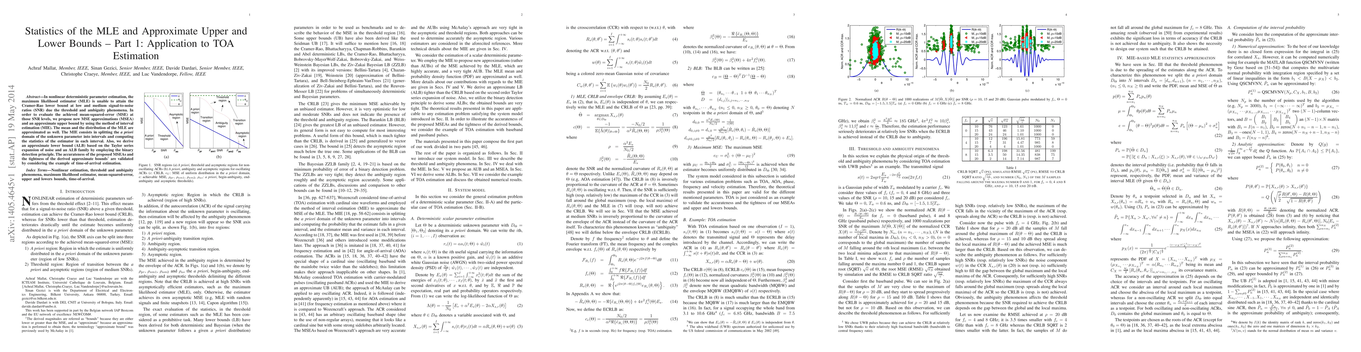 In nonlinear deterministic parameter estimation, the maximum likelihood estimator (MLE) is unable to attain the Cramer-Rao lower bound at low and medium signal-to-noise ratios (SNR) due the threshold and ambiguity phenomena. In order to evaluate the achieved mean-squared-error (MSE) at those SNR levels, we propose new MSE approximations (MSEA) and an approximate upper bound by using the method of interval estimation (MIE). The mean and the distribution of the MLE are approximated as well. The MIE consists in splitting the a priori domain of the unknown parameter into intervals and computing the statistics of the estimator in each interval. Also, we derive an approximate lower bound (ALB) based on the Taylor series expansion of noise and an ALB family by employing the binary detection principle. The accurateness of the proposed MSEAs and the tightness of the derived approximate bounds are validated by considering the example of time-of-arrival estimation.