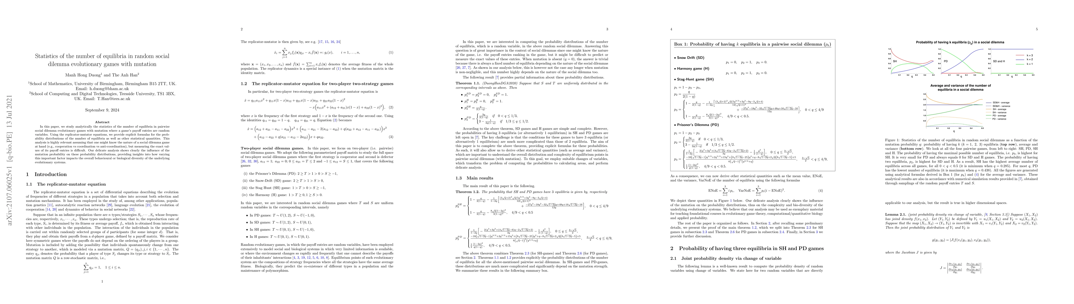 In this paper, we study analytically the statistics of the number of equilibria in pairwise social dilemma evolutionary games with mutation where a game's payoff entries are random variables. Using the replicator-mutator equations, we provide explicit formulas for the probability distributions of the number of equilibria as well as other statistical quantities. This analysis is highly relevant assuming that one might know the nature of a social dilemma game at hand (e.g., cooperation vs coordination vs anti-coordination), but measuring the exact values of its payoff entries is difficult. Our delicate analysis shows clearly the influence of the mutation probability on these probability distributions, providing insights into how varying this important factor impacts the overall behavioural or biological diversity of the underlying evolutionary systems.