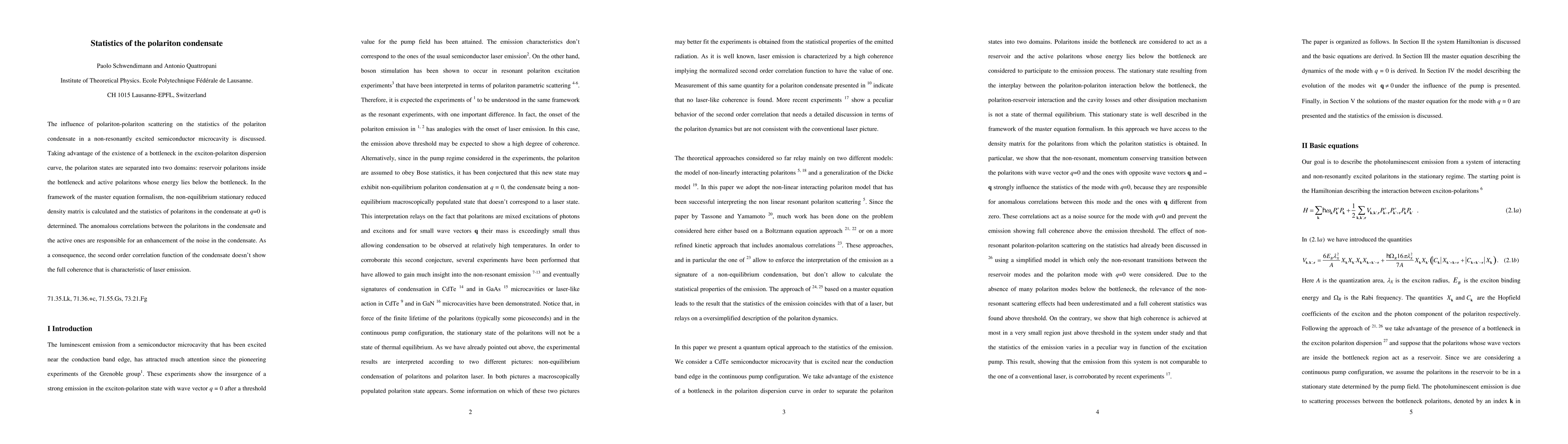 The influence of polariton-polariton scattering on the statistics of the polariton condensate in a non-resonantly excited semiconductor quantum well embedded in a CdTe semiconductor microcavity is discussed. Taking advantage of the existence of a bottleneck in the polariton dispersion curve, the polariton states are separated into two domains: reservoir polaritons inside the bottleneck and active polaritons with wave vector q whose energy lies below the bottleneck. In the framework of the master equation formalism, the non-equilibrium stationary reduced density matrix is calculated and the statistics of polaritons in the condensate at q=0 is determined. The anomalous correlations between the polaritons in the condensate and those with wave vectors q, -q leads to an enhancement of the noise in the condensate. As a consequence, the second order correlation function of the condensate does not show the full coherence that is characteristic of laser emission.