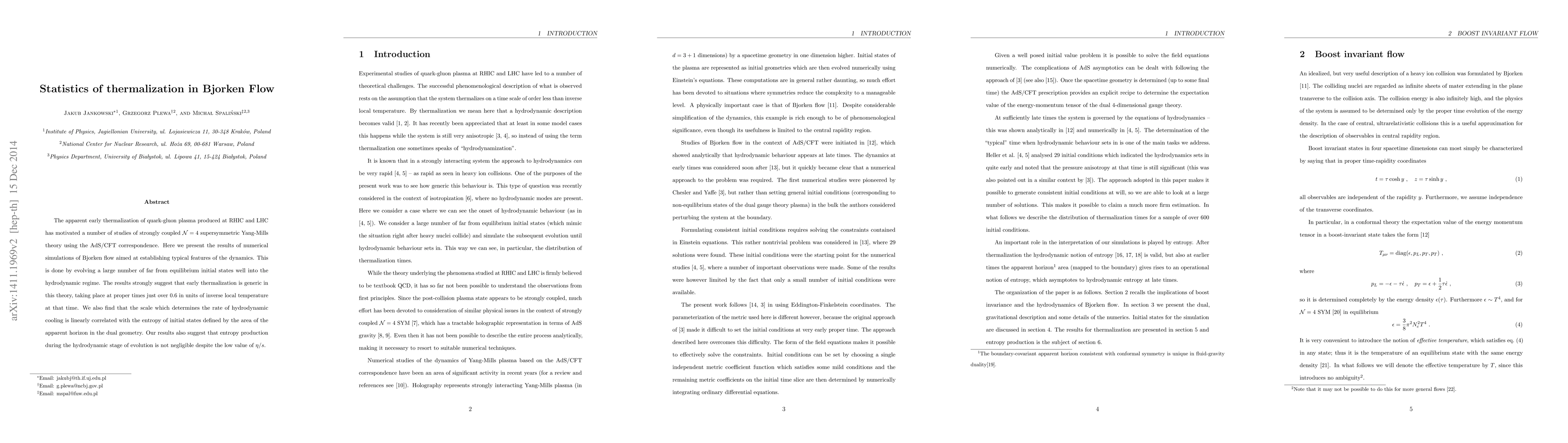 The apparent early thermalization of quark-gluon plasma produced at RHIC and LHC has motivated a number of studies of strongly coupled ${\mathcal N}=4$ supersymmetric Yang-Mills theory using the AdS/CFT correspondence. Here we present the results of numerical simulations of Bjorken flow aimed at establishing typical features of the dynamics. This is done by evolving a large number of far from equilibrium initial states well into the hydrodynamic regime. The results strongly suggest that early thermalization is generic in this theory, taking place at proper times around $0.6$ in units of inverse local temperature. We also find that the scale which determines the rate of hydrodynamic cooling is linearly correlated with the entropy of initial states defined by the area of the apparent horizon in the dual geometry. Our results also suggest that entropy production during the hydrodynamic stage of evolution is not negligible despite the low value of $\eta/s$.