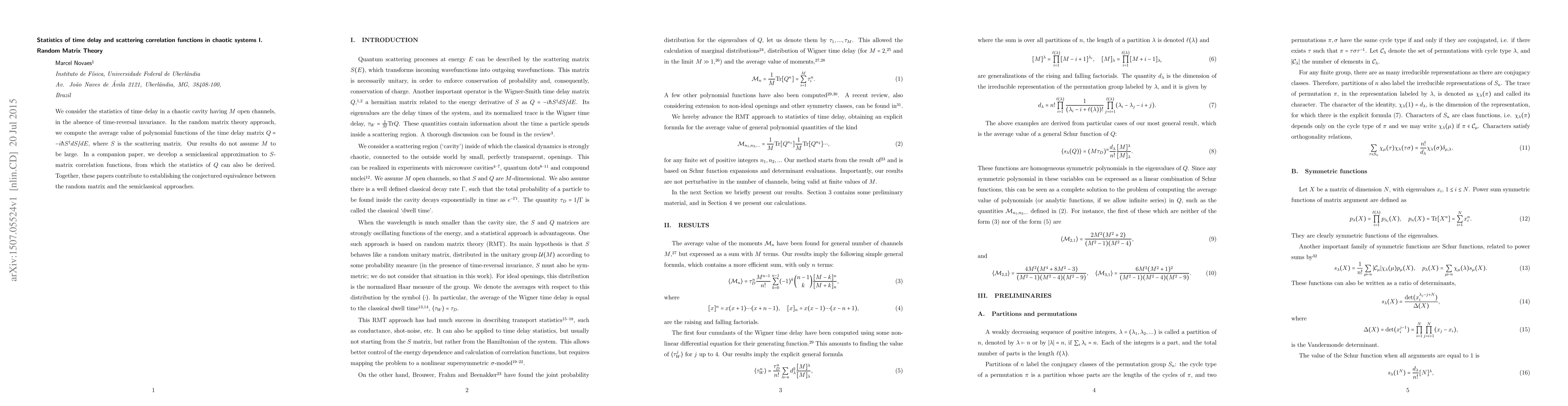 This paper investigates the statistics of time delay in chaotic cavities with $M$ open channels, using random matrix theory to compute the average value of polynomial functions of the time delay matrix. The study does not require $M$ to be large and aims to establish the equivalence between random matrix and semiclassical approaches, as further developed in a companion paper.