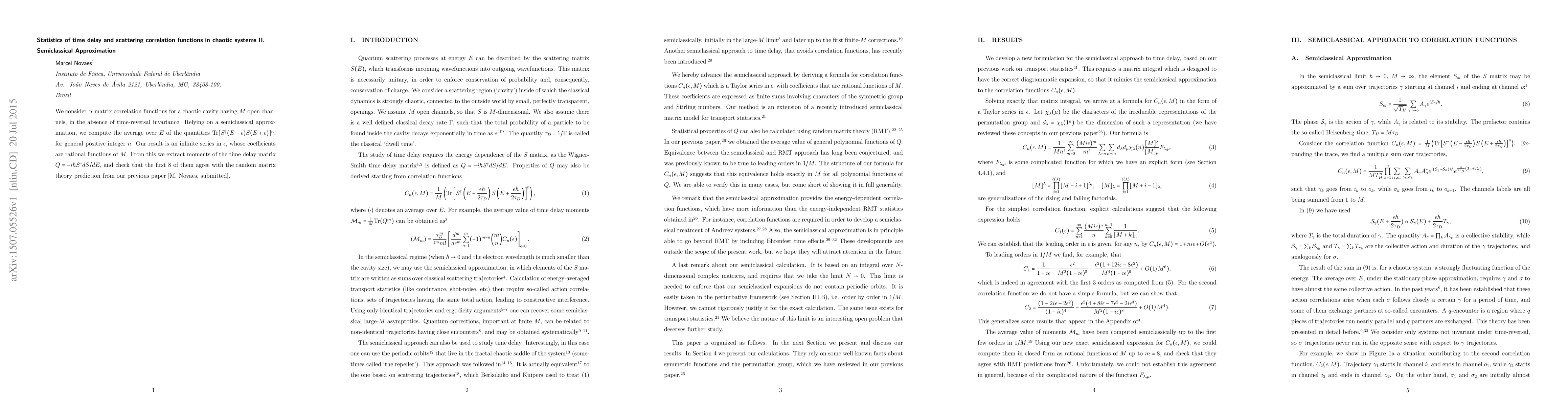 This paper computes $S$-matrix correlation functions for a chaotic cavity using a semiclassical approximation, deriving an infinite series in time delay matrix moments. The first eight moments match predictions from random matrix theory, confirming the approach's validity.