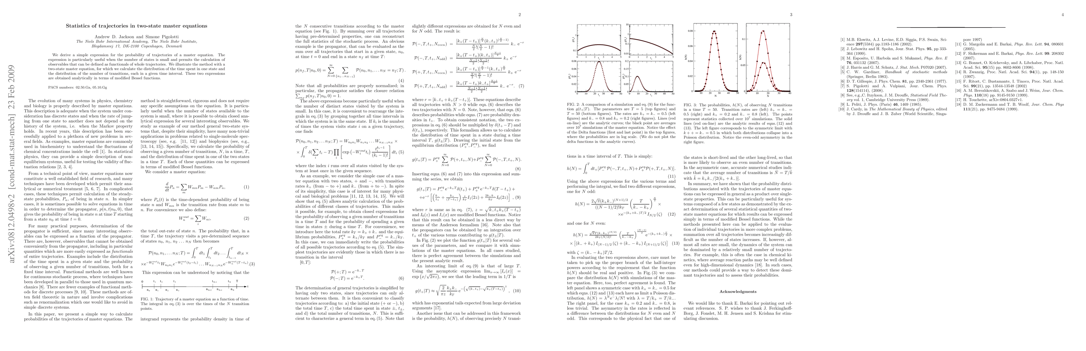 We derive a simple expression for the probability of trajectories of a master equation. The expression is particularly useful when the number of states is small and permits the calculation of observables that can be defined as functionals of whole trajectories. We illustrate the method with a two-state master equation, for which we calculate the distribution of the time spent in one state and the distribution of the number of transitions, each in a given time interval. These two expressions are obtained analytically in terms of modified Bessel functions.
