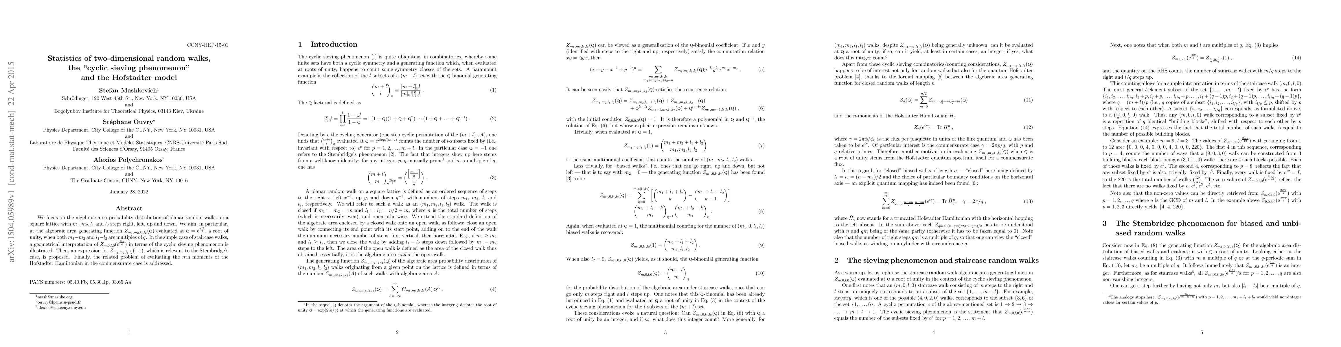 This paper investigates the algebraic area probability distribution of two-dimensional random walks on a square lattice, focusing on the generating function evaluated at roots of unity. It also explores the cyclic sieving phenomenon in staircase walks and proposes an expression relevant to Stembridge's case, alongside addressing the n-th moments of the Hofstadter Hamiltonian.