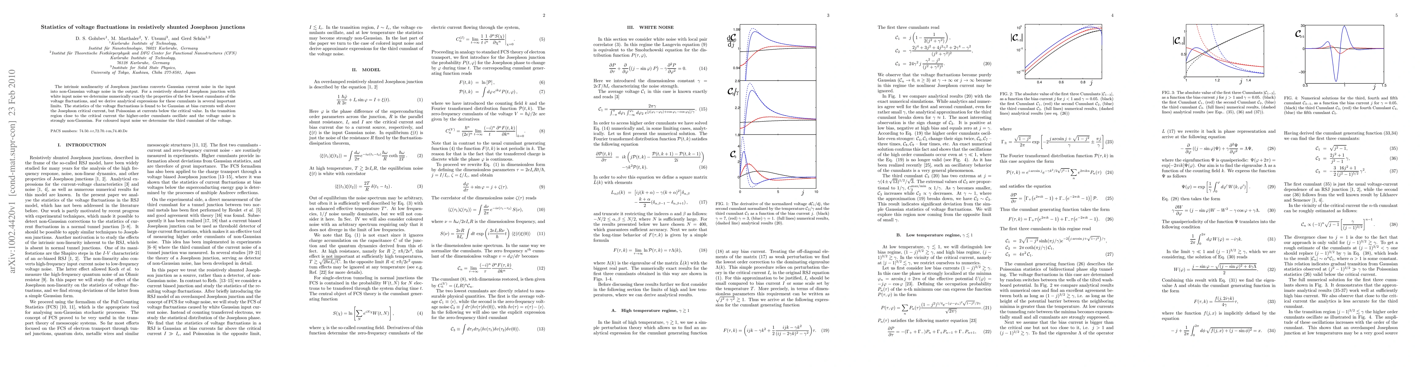 The paper investigates the statistics of voltage fluctuations in resistively shunted Josephson junctions, revealing Gaussian noise at high bias currents, Poissonian noise below the critical current, and non-Gaussian oscillations near the critical current. Analytical and numerical methods are used to determine the properties of voltage fluctuations under different noise conditions.