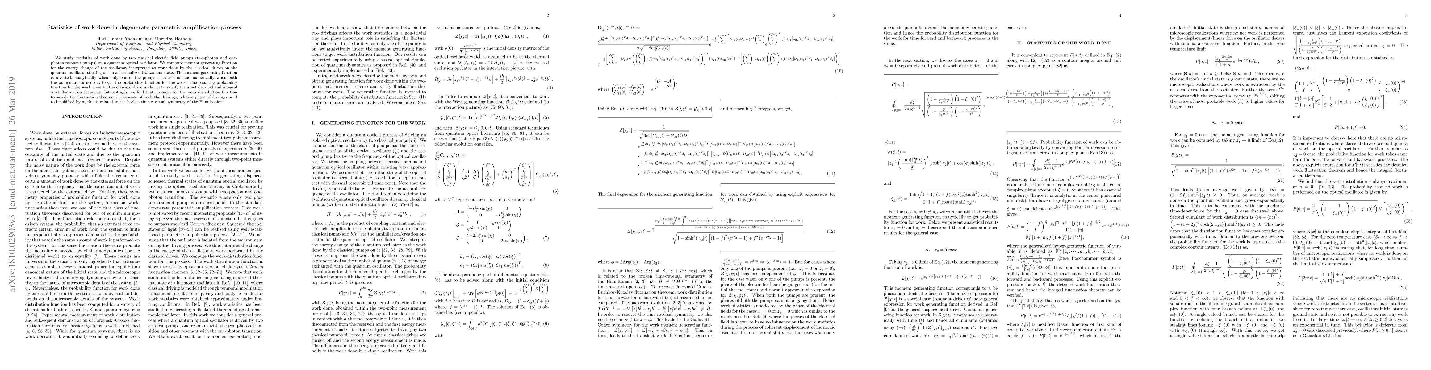 This paper investigates the statistics of work performed by two classical electric field pumps on a quantum optical oscillator, deriving the probability function for the work done. It finds that the work distribution satisfies fluctuation theorems, with the phase relationship between the pumps affecting the satisfaction of these theorems due to broken time reversal symmetry.