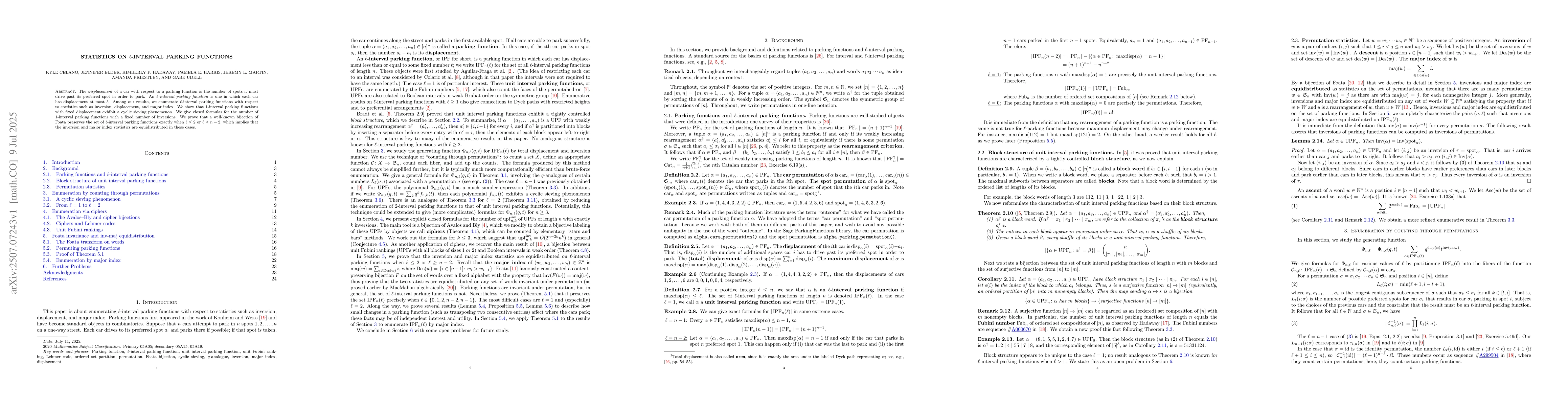 The displacement of a car with respect to a parking function is the number of spots it must drive past its preferred spot in order to park. An $\ell$-interval parking function is one in which each car has displacement at most $\ell$. Among our results, we enumerate $\ell$-interval parking functions with respect to statistics such as inversion, displacement, and major index. We show that $1$-interval parking functions with fixed displacement exhibit a cyclic sieving phenomenon. We give closed formulas for the number of $1$-interval parking functions with a fixed number of inversions. We prove that a well-known bijection of Foata preserves the set of $\ell$-interval parking functions exactly when $\ell\leq 2$ or $\ell\geq n-2$, which implies that the inversion and major index statistics are equidistributed in these cases.
