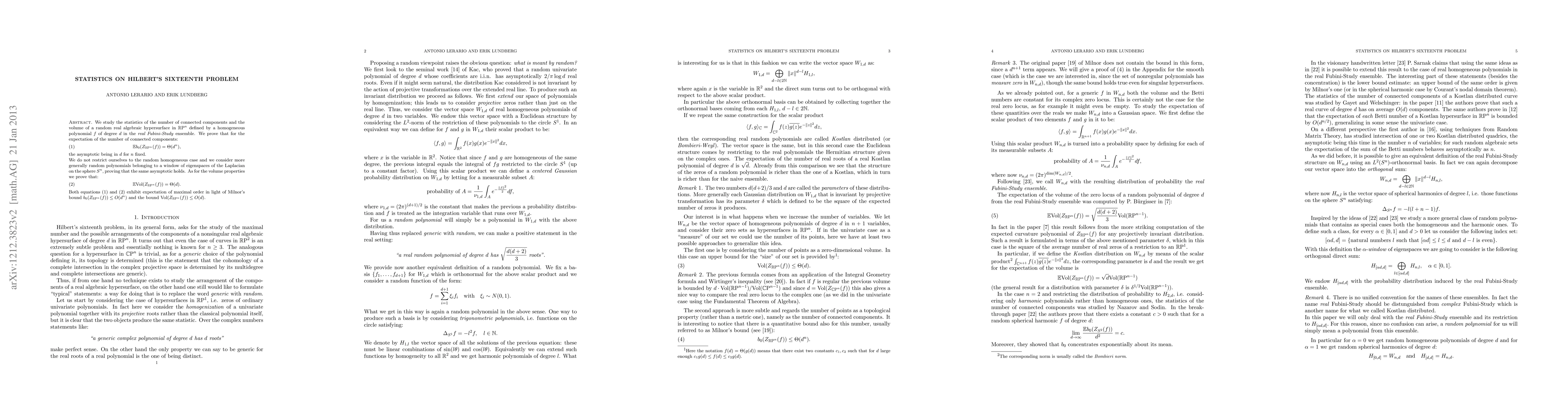 Researchers studied the statistics of random real algebraic hypersurfaces in RP^n, finding that the expected number of connected components has order d^n and the volume's expectation is of order d, with behaviors exhibiting maximal order compared to established bounds.