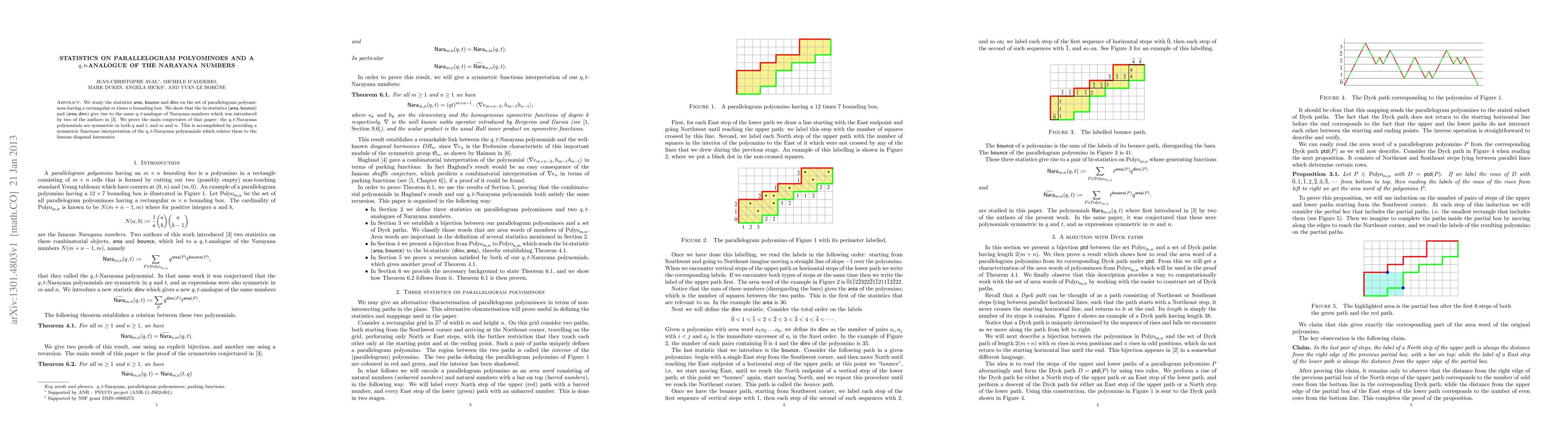 This paper investigates the statistics area, bounce, and dinv on parallelogram polyominoes within a rectangular m by n bounding box. It demonstrates that the bi-statistics (area, bounce) and (area, dinv) yield the same q,t-analogue of Narayana numbers, proving the conjectures of symmetry in q,t and m,n through a symmetric functions interpretation linked to diagonal harmonics.