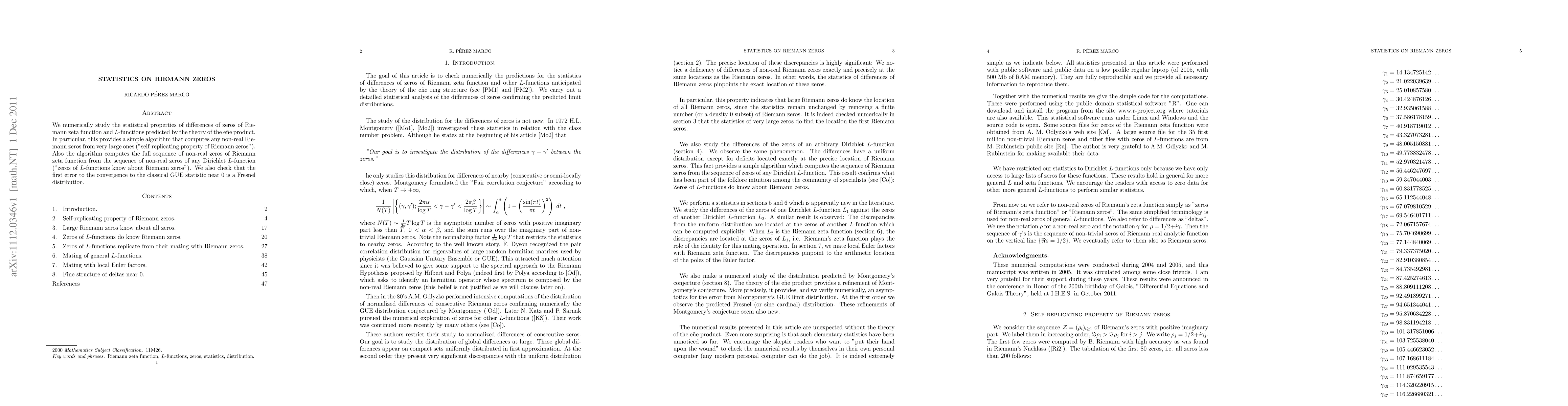 This paper numerically investigates the statistical properties of the differences between zeros of the Riemann zeta function and L-functions, revealing a self-replicating property of Riemann zeros and an algorithm that computes all non-real zeros from large ones. It also demonstrates that the zeros of L-functions can predict Riemann zeros, and finds the first error to convergence to the classical GUE statistic near zero follows a Fresnel distribution.