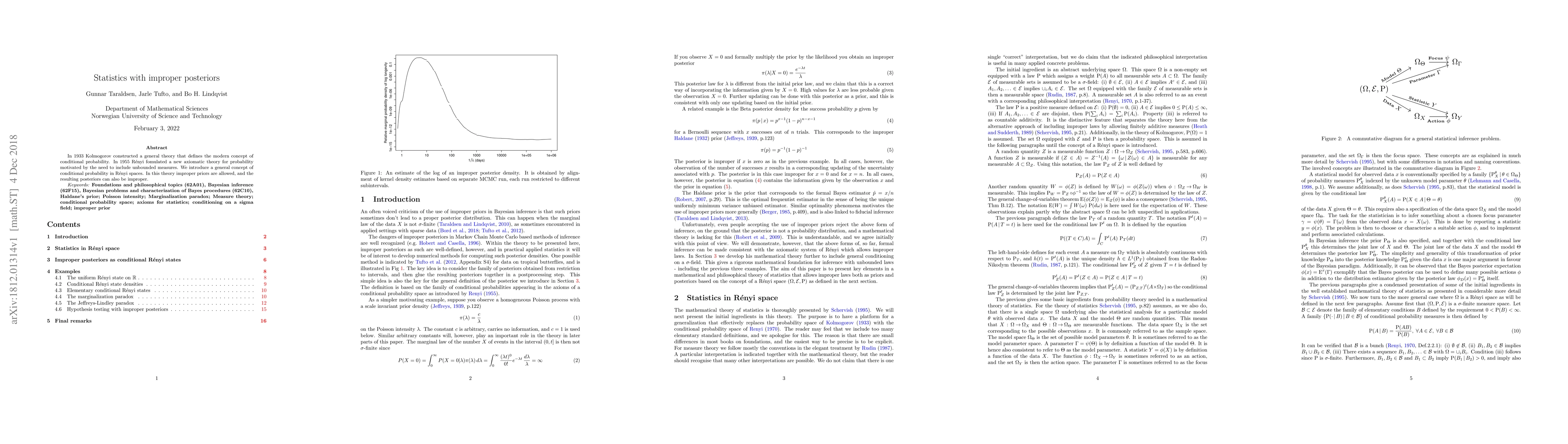 In 1933 Kolmogorov constructed a general theory that defines the modern concept of conditional probability. In 1955 Renyi fomulated a new axiomatic theory for probability motivated by the need to include unbounded measures. We introduce a general concept of conditional probability in Renyi spaces. In this theory improper priors are allowed, and the resulting posteriors can also be improper.