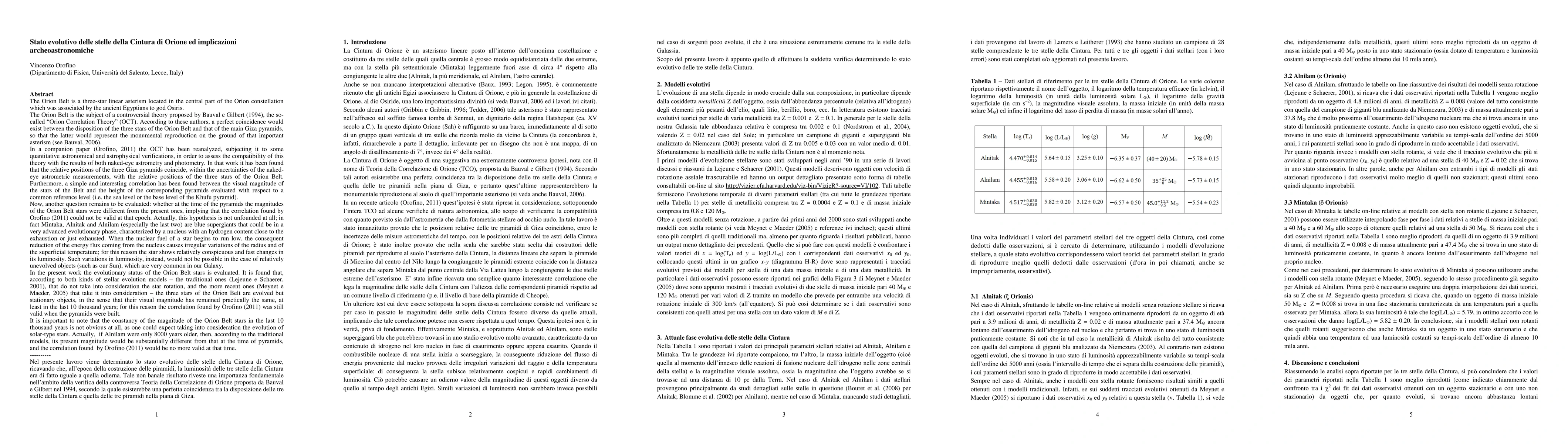 In the present work it is evaluated the evolutionary state of the Orion Belt stars, an asterism very important for the ancient Egyptians, finding that, when the pyramids were built, the brightness of the three stars of the Belt was practically the same as today. This not trivial result has important implications in the framework of the so-called Orion Correlation Theory, a controversial theory proposed by Bauval and Gilbert (1994), according to which a perfect coincidence would exist between the disposition of the three stars of the Orion Belt and that of the main Giza pyramids, so that the latter would represent the monumental reproduction on the ground of that important asterism. ---- Nel presente lavoro viene determinato lo stato evolutivo delle stelle della Cintura di Orione, ricavando che, all'epoca della costruzione delle piramidi, la luminosita' delle tre stelle della Cintura era di fatto uguale a quella odierna. Tale non banale risultato riveste una importanza fondamentale nell'ambito della verifica della controversa Teoria della Correlazione di Orione proposta da Bauval e Gilbert nel 1994, secondo la quale esisterebbe una perfetta coincidenza tra la disposizione delle tre stelle della Cintura e quella delle tre piramidi nella piana di Giza.