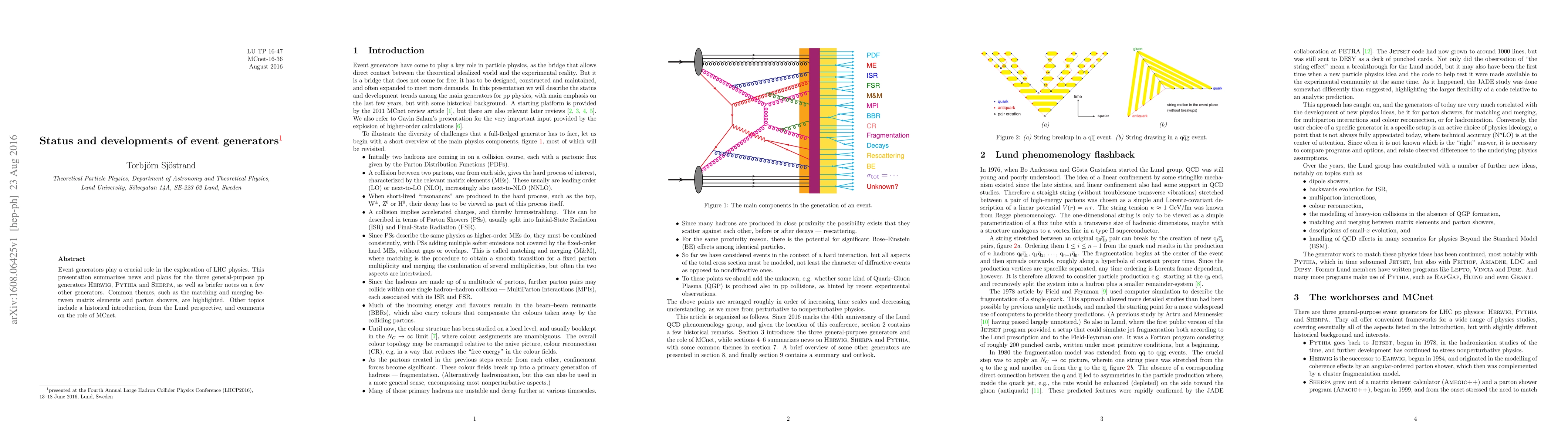 This paper reviews the current status and future plans of the three main event generators HERWIG, PYTHIA, and SHERPA used in LHC physics, emphasizing advancements in matching and merging techniques, and provides a historical perspective from the Lund model, along with insights on the MCnet initiative.