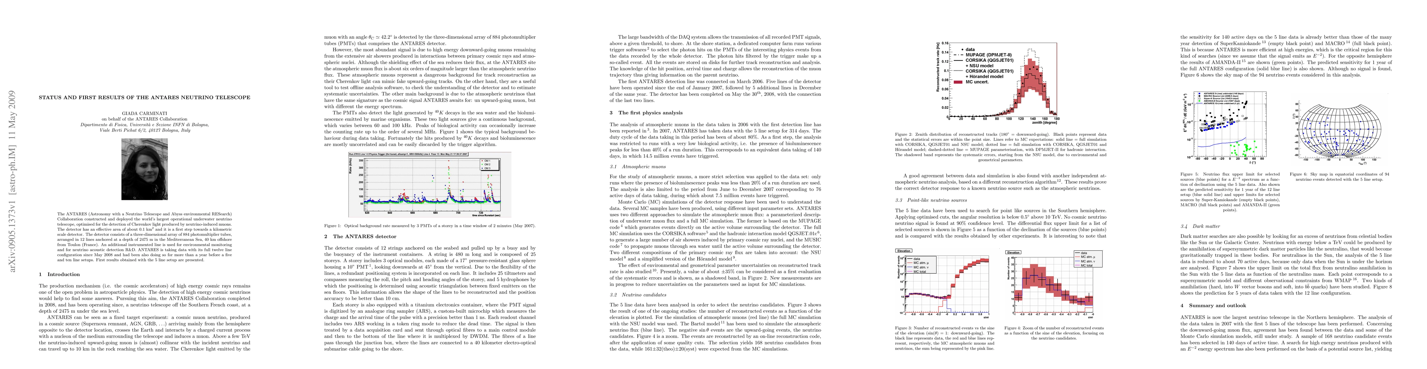 The ANTARES telescope, the largest operational underwater neutrino detector, has been deployed in the Mediterranean Sea to detect Cherenkov light from neutrino-induced muons. Initial results from its five-line configuration show promising data collection, marking a significant step towards future kilometer-scale neutrino detection.