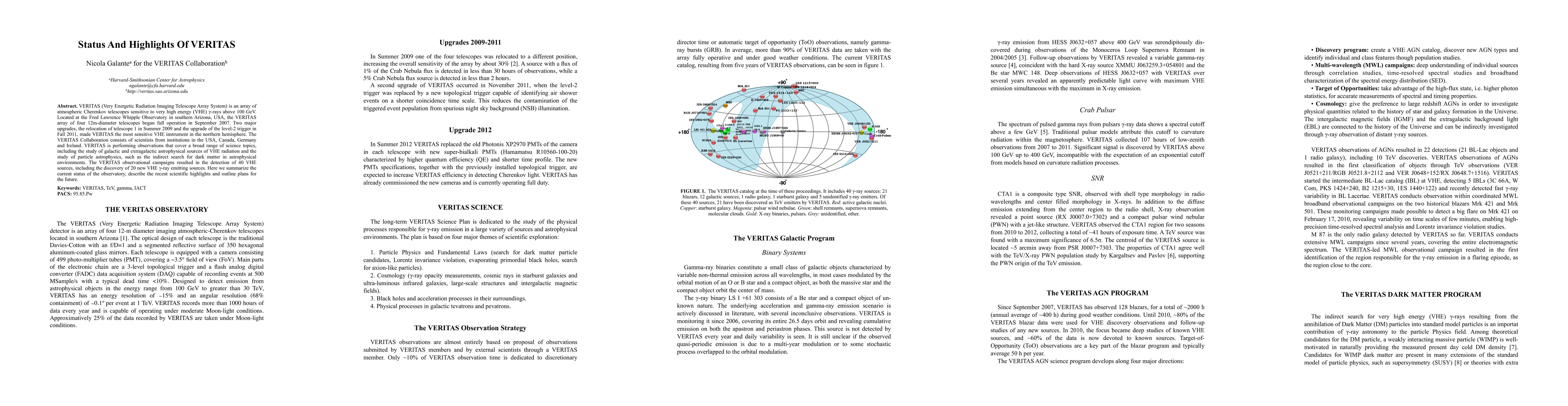 VERITAS (Very Energetic Radiation Imaging Telescope Array System) is an array of atmospheric Cherenkov telescopes sensitive to very high energy (VHE) gamma-rays above 100 GeV. Located at the Fred Lawrence Whipple Observatory in southern Arizona, USA, the VERITAS array of four 12m-diameter telescopes began full operation in September 2007. Two major upgrades, the relocation of telescope 1 in Summer 2009 and the upgrade of the level-2 trigger in Fall 2011, made VERITAS the most sensitive VHE instrument in the northern hemisphere. The VERITAS Collaboration consists of scientists from institutions in the USA, Canada, Germany and Ireland. VERITAS is performing observations that cover a broad range of science topics, including the study of galactic and extragalactic astrophysical sources of VHE radiation and the study of particle astrophysics, such as the indirect search for dark matter in astrophysical environments. The VERITAS observational campaigns resulted in the detection of 40 VHE sources, including the discovery of 20 new VHE gamma-ray emitting sources. Here we summarize the current status of the observatory, describe the recent scientific highlights and outline plans for the future.